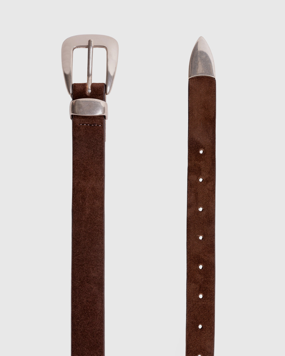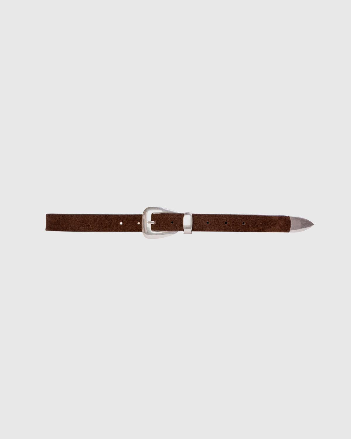 Silver plated brass with western 3 piece shaped buckle. Secured on a brushed kid suede strap.