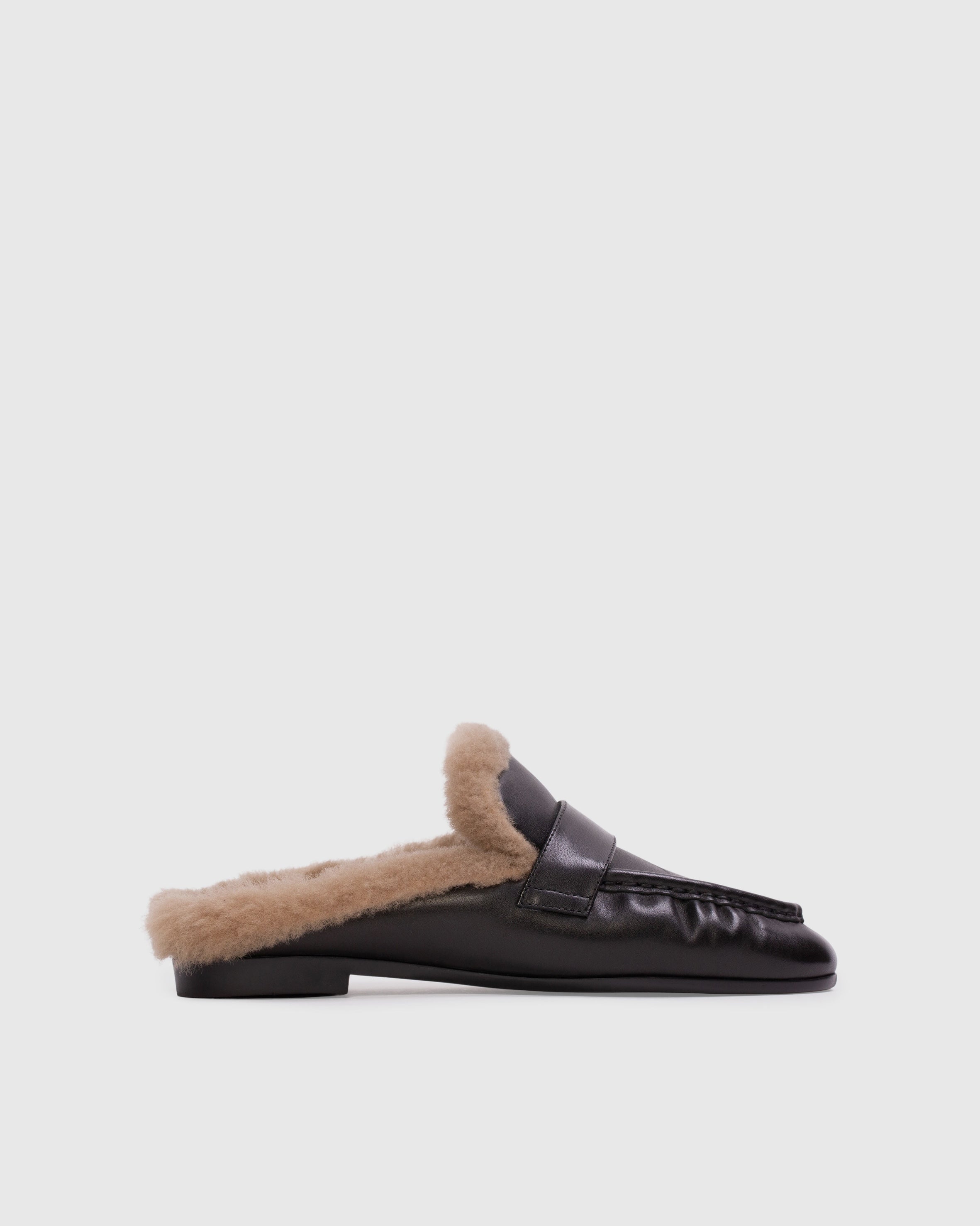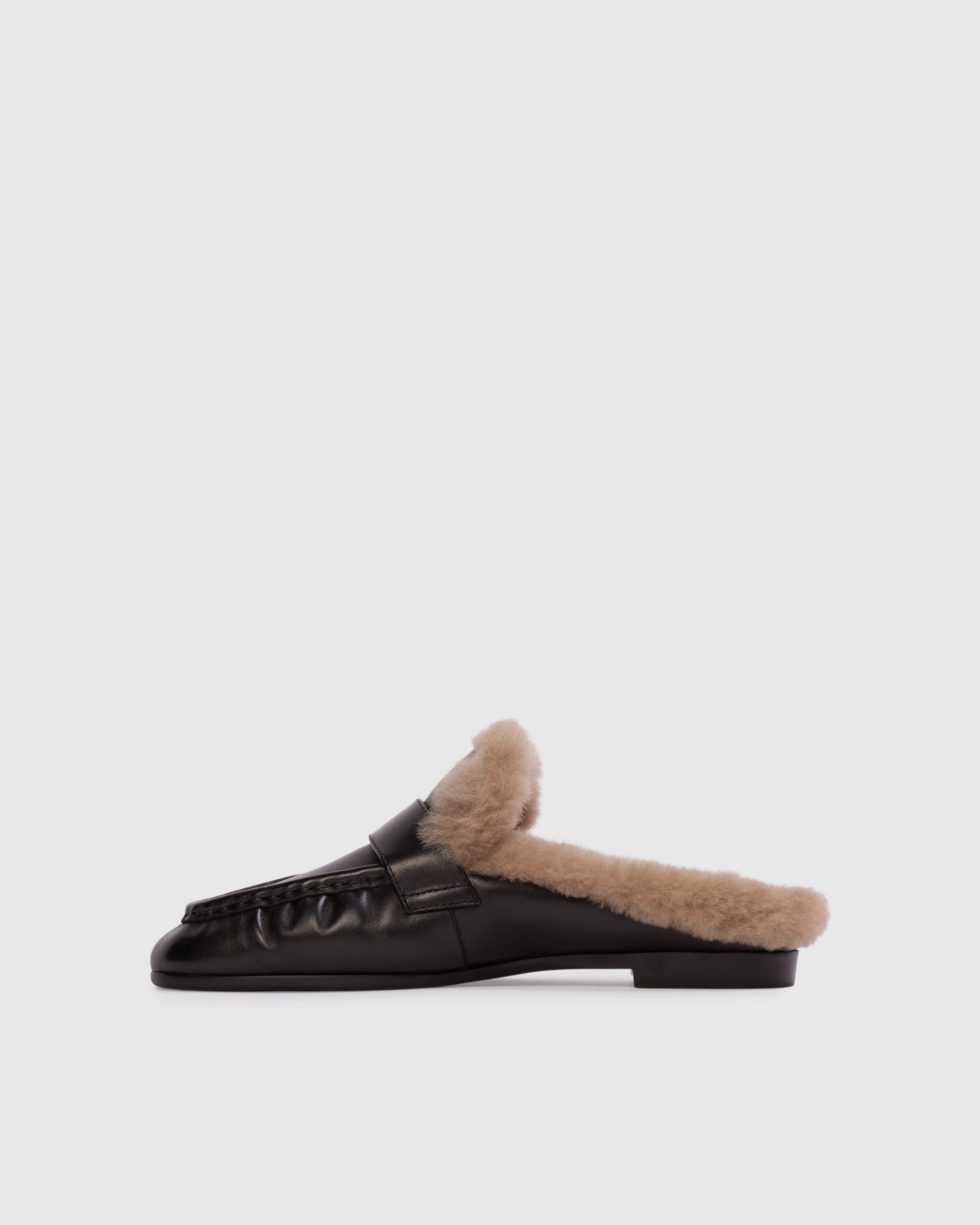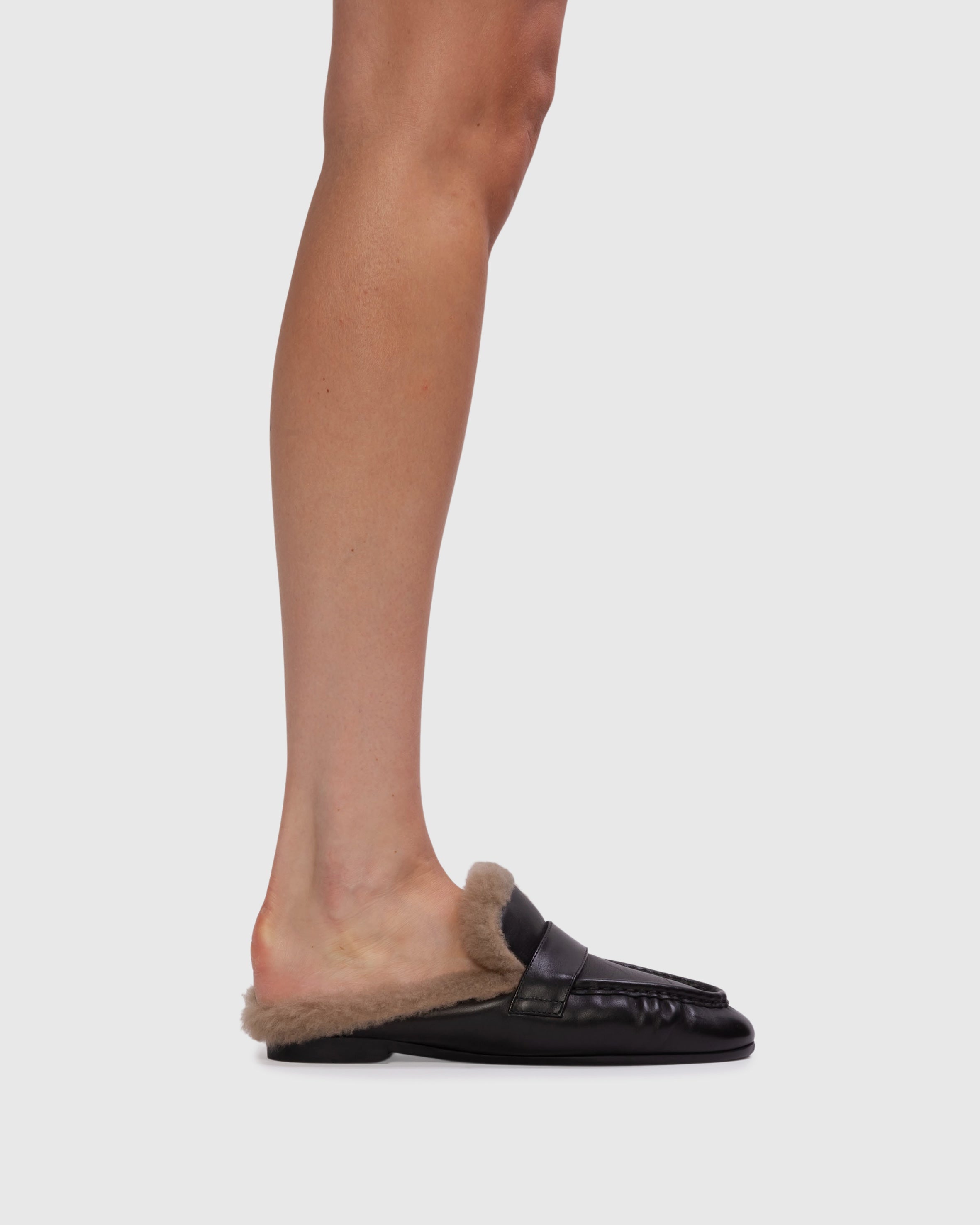 Round toe loafer slip on mule with shearling footbed. Made with smooth buffed baby calf leather.