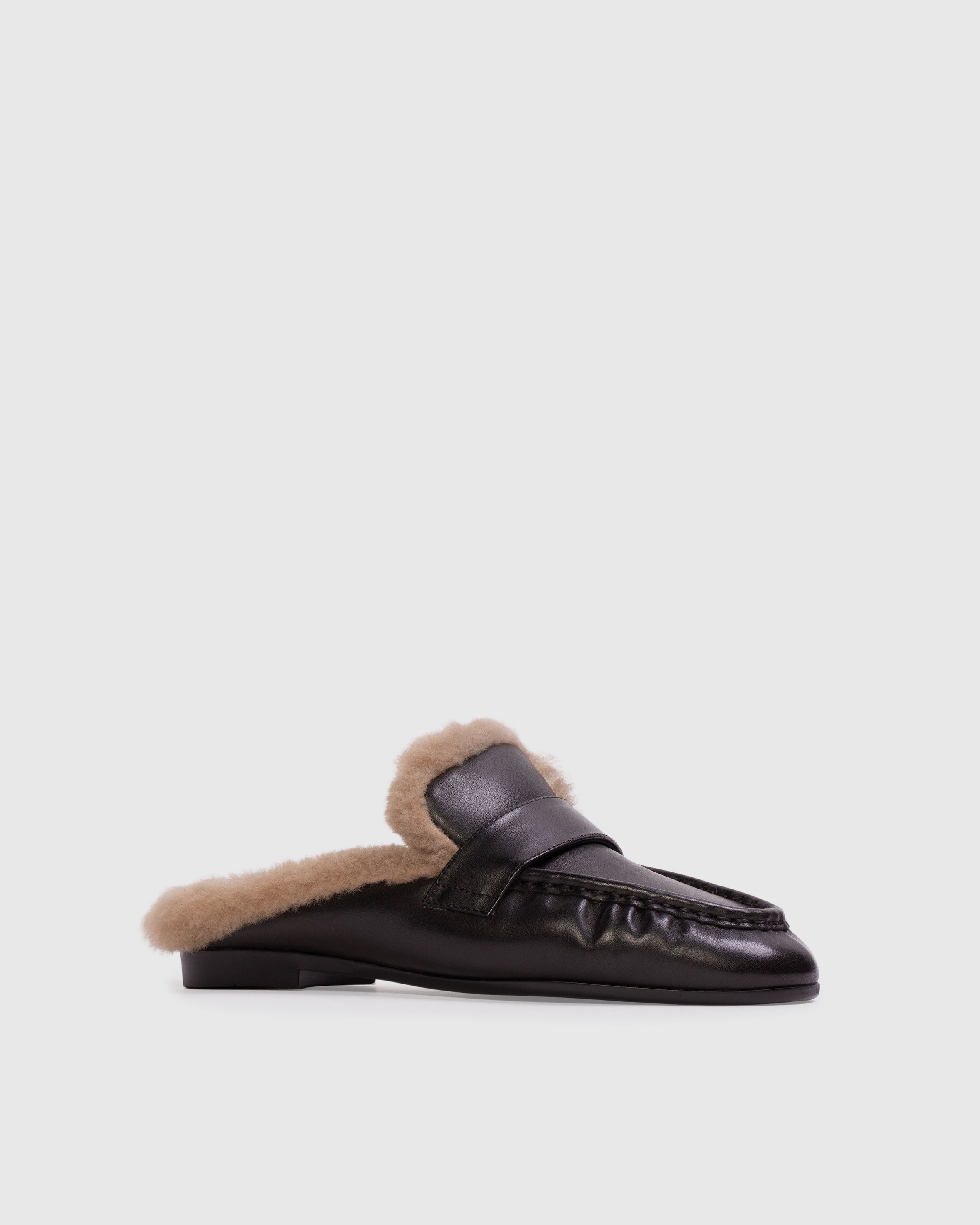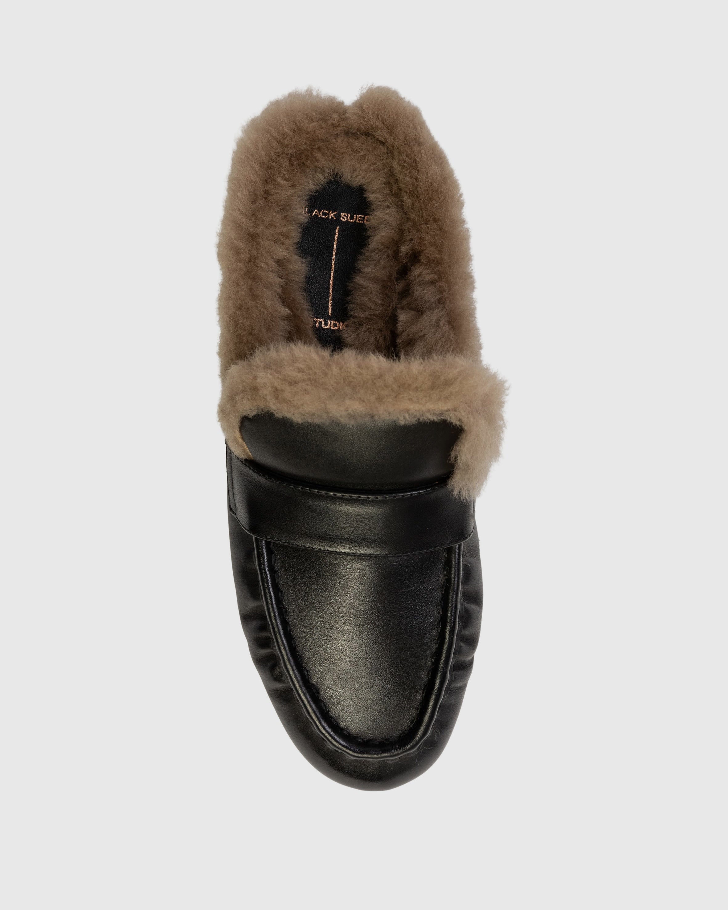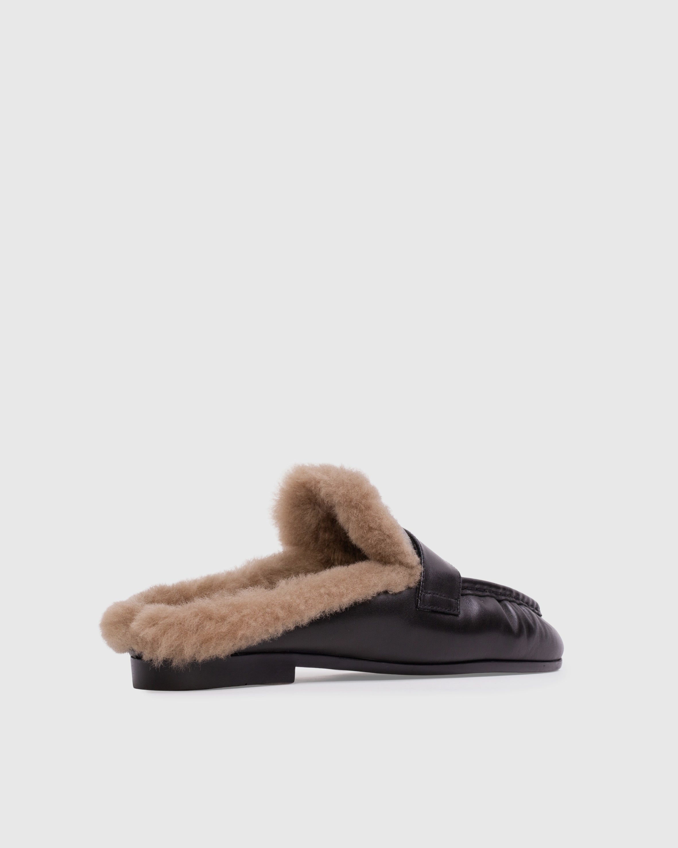 Round toe loafer slip on mule with shearling footbed. Made with smooth buffed baby calf leather.
