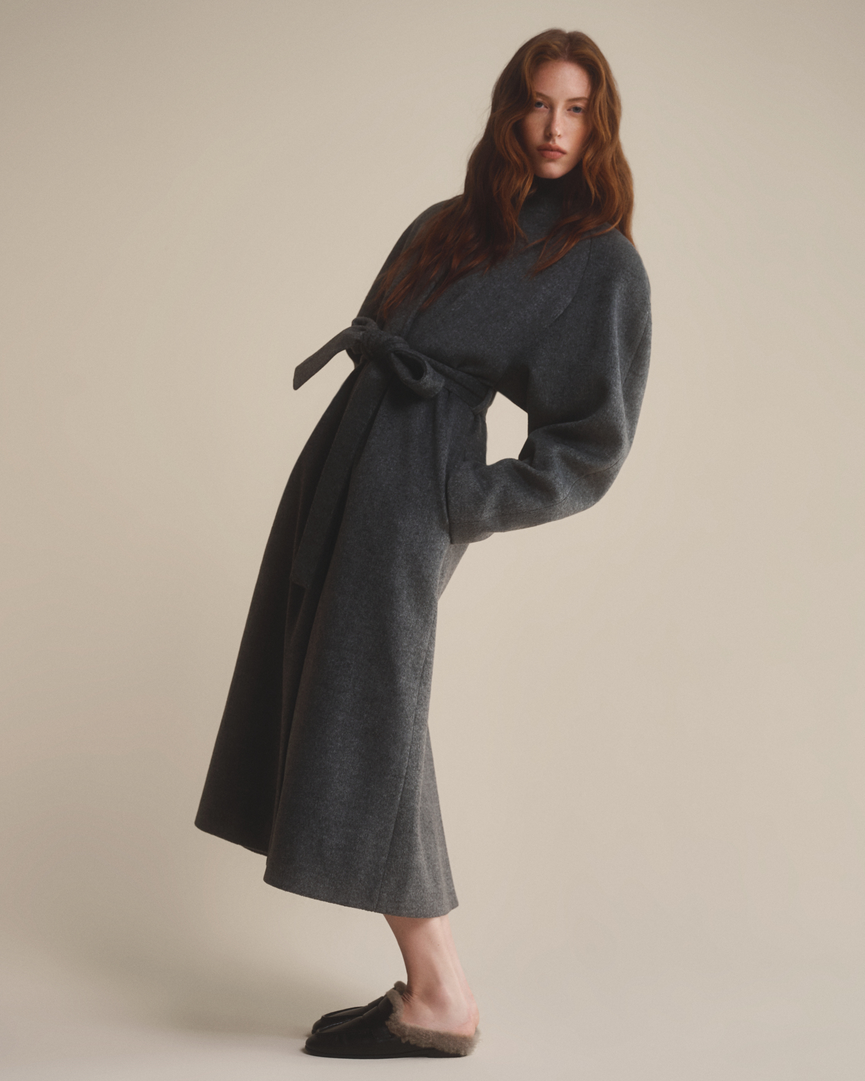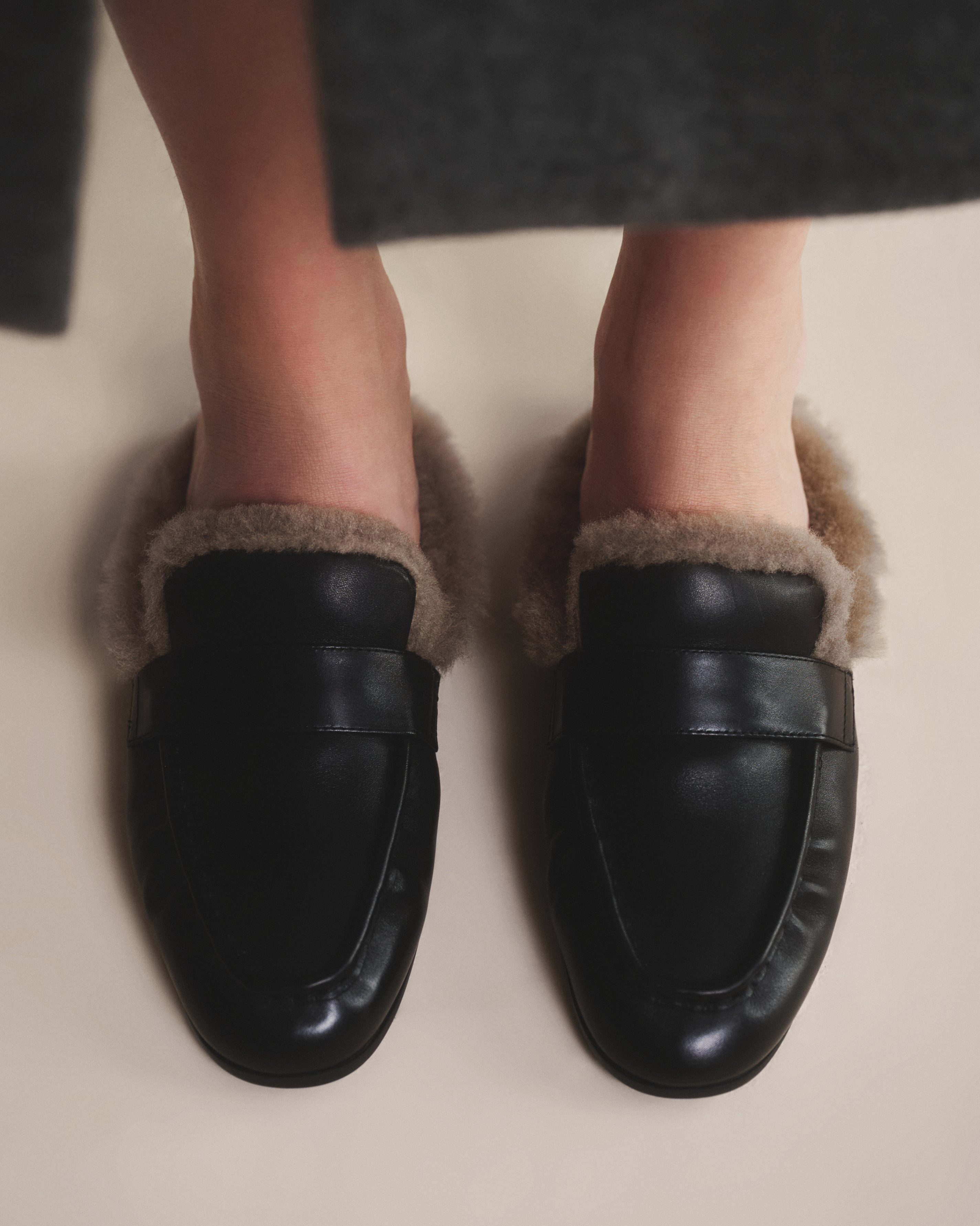 Classic round toe backless slip on loafer with shearling footbed. Made with smooth buffed baby calf leather.