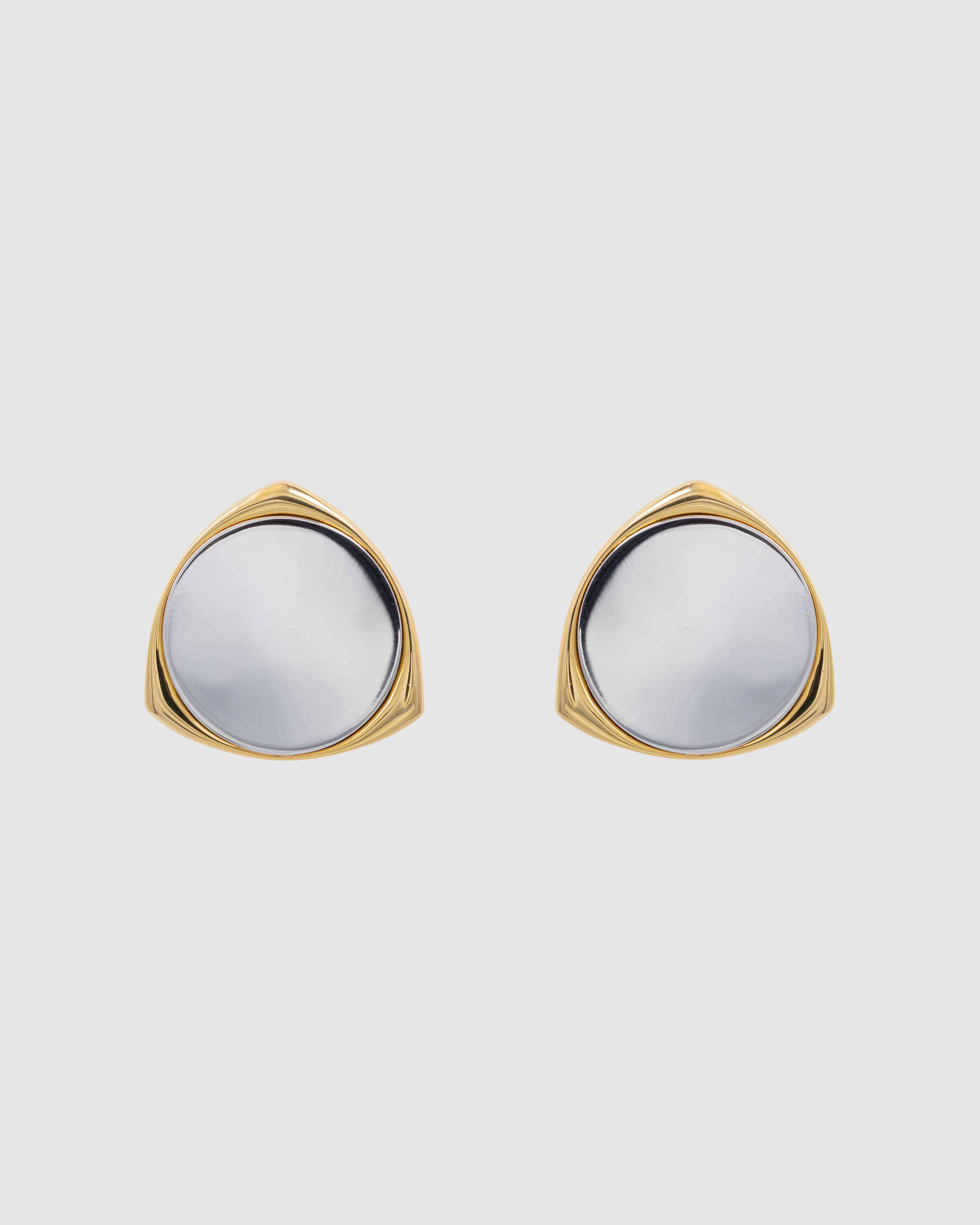 Triangle shaped pair of earrings crafted with 18k gold-plated plated brass and center piece of rhodium-plated brass. These wearable, lightweight earrings feature a vintage elevated aesthetic.