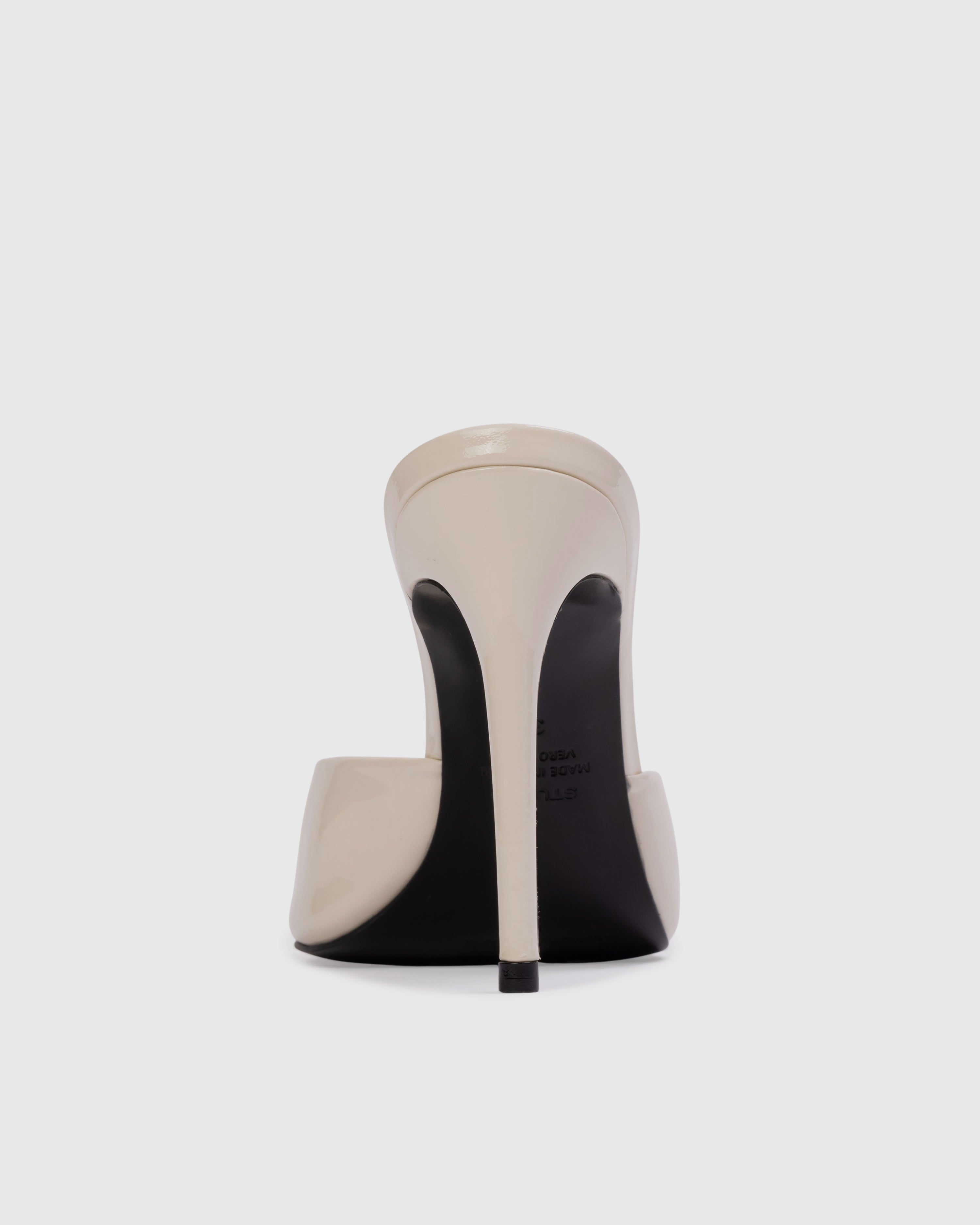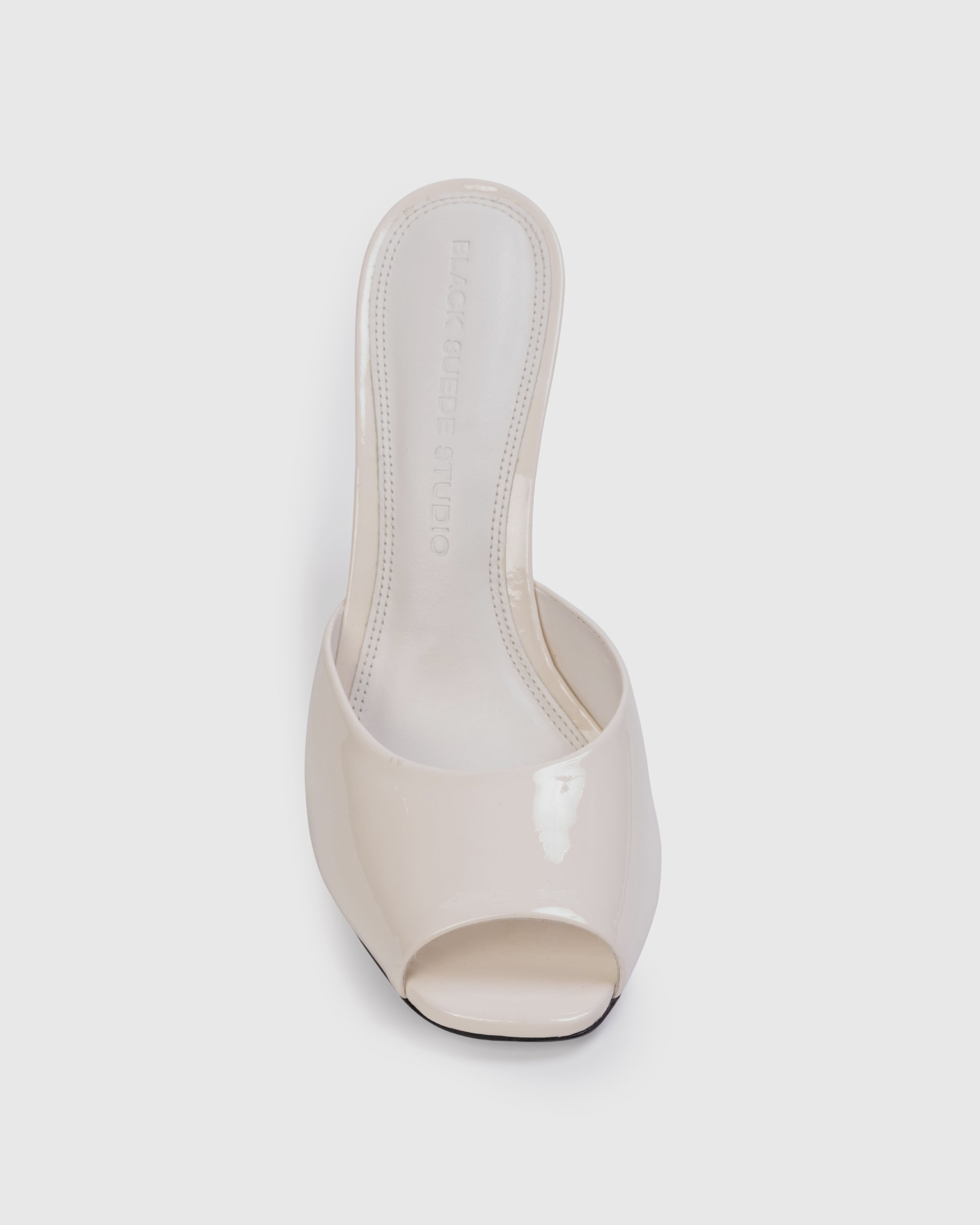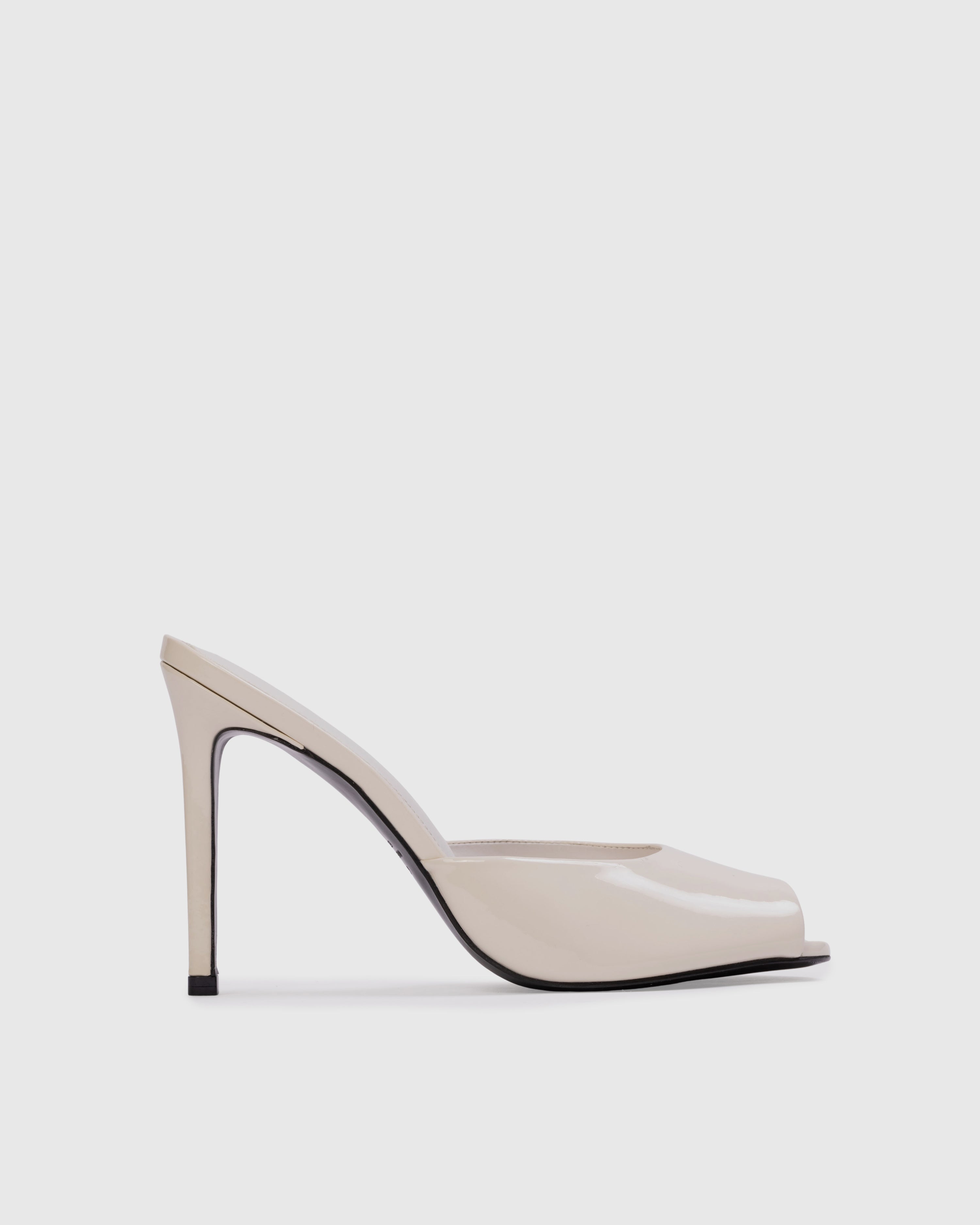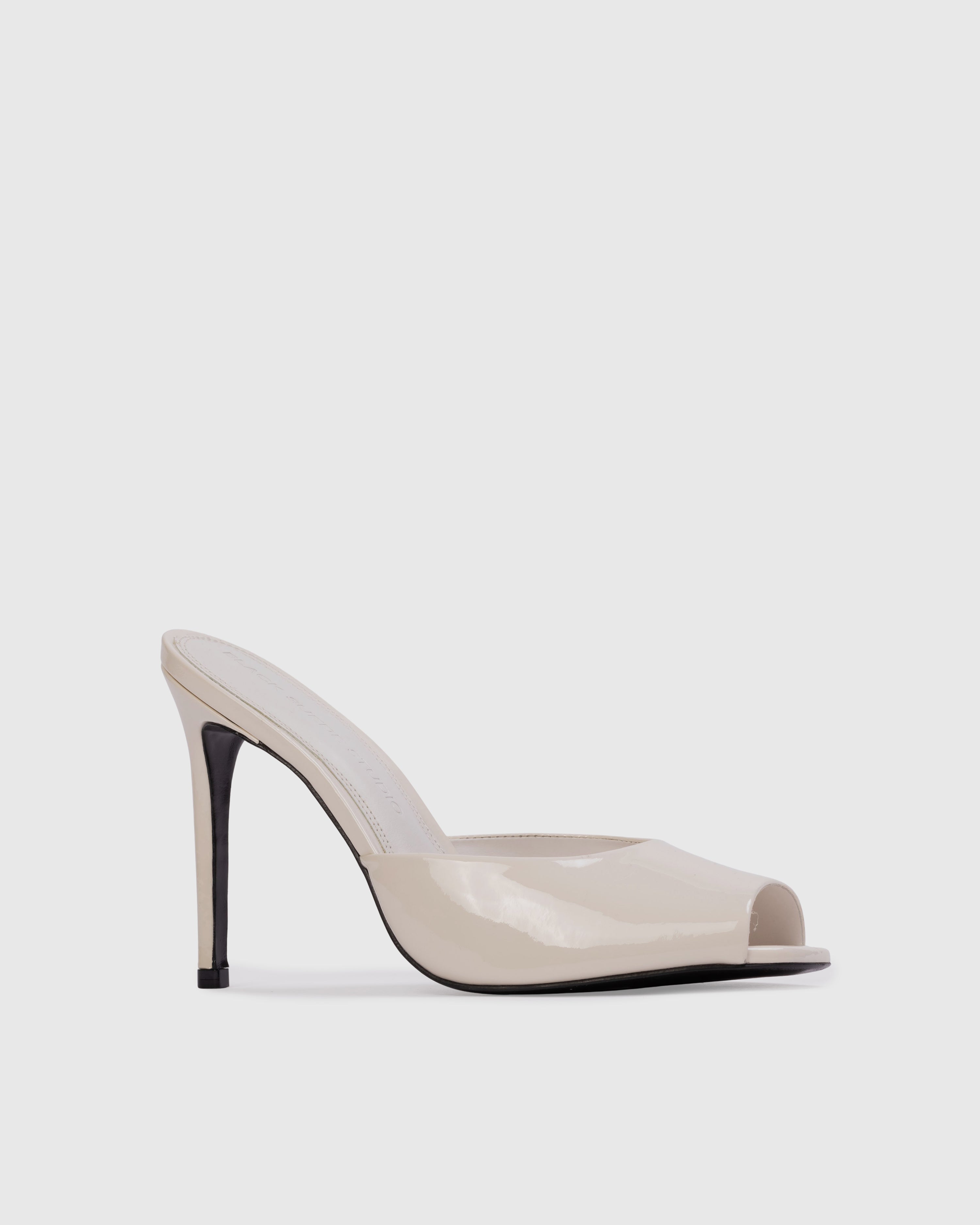 Micro peep toe mule, set on a straight stiletto heel. Made with smooth patent finished leather.