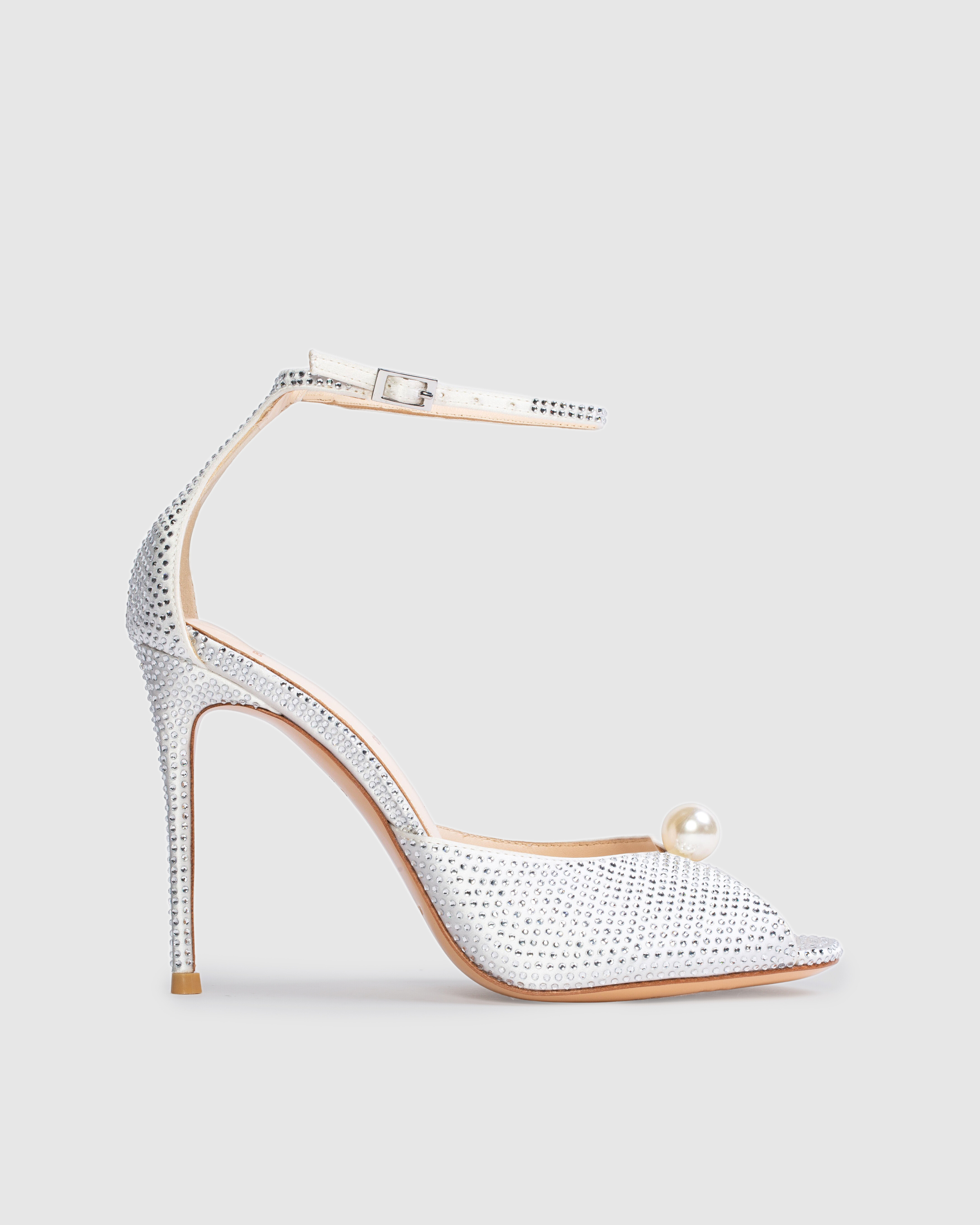 Round toe embellished sandal with pearl detailing, set on a stiletto pin heel. Made with satin crepe.
