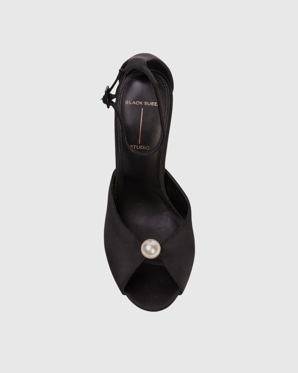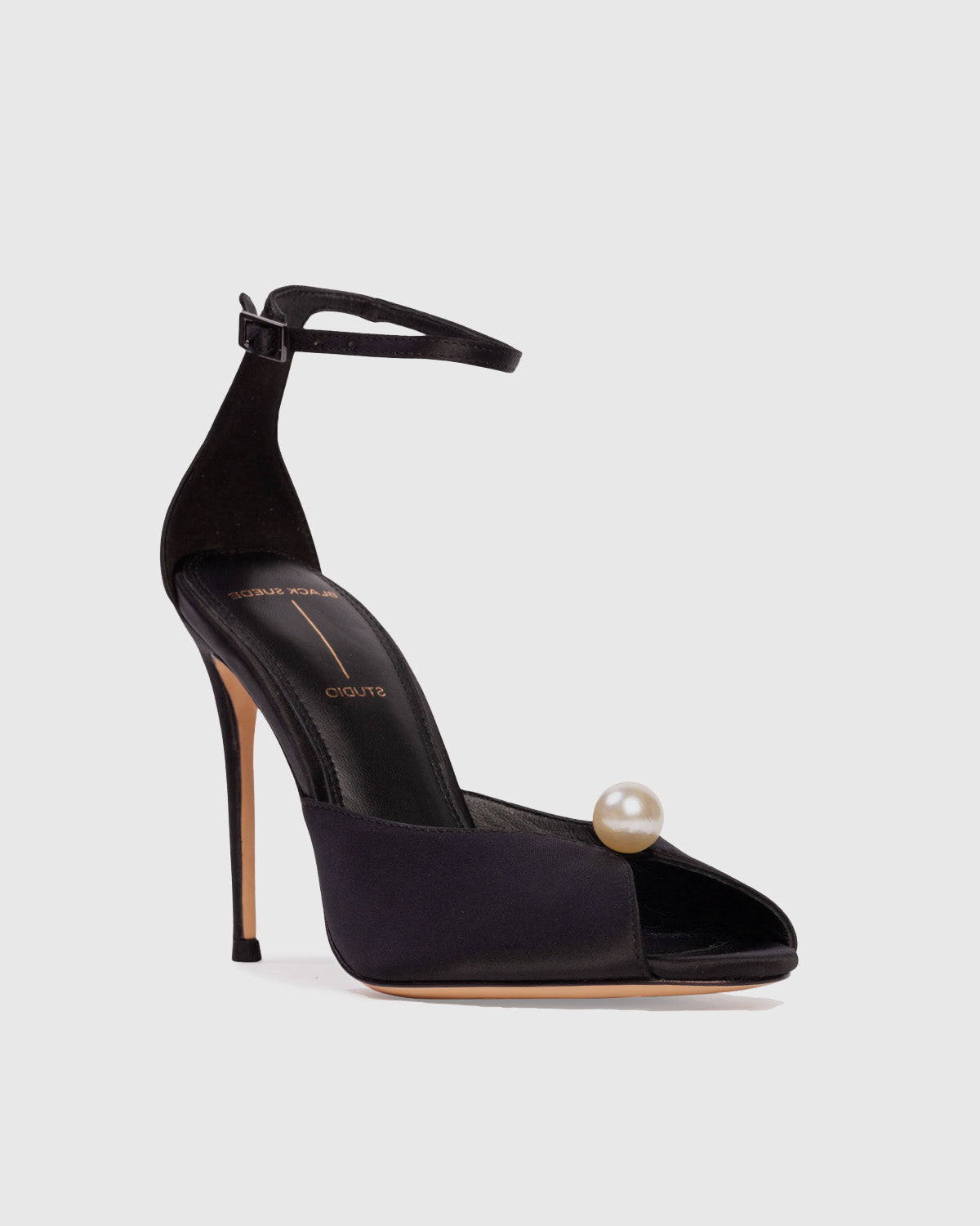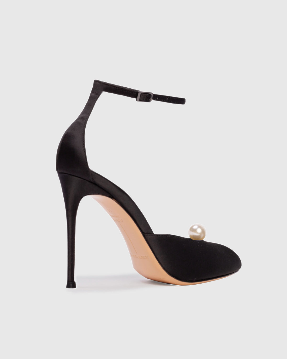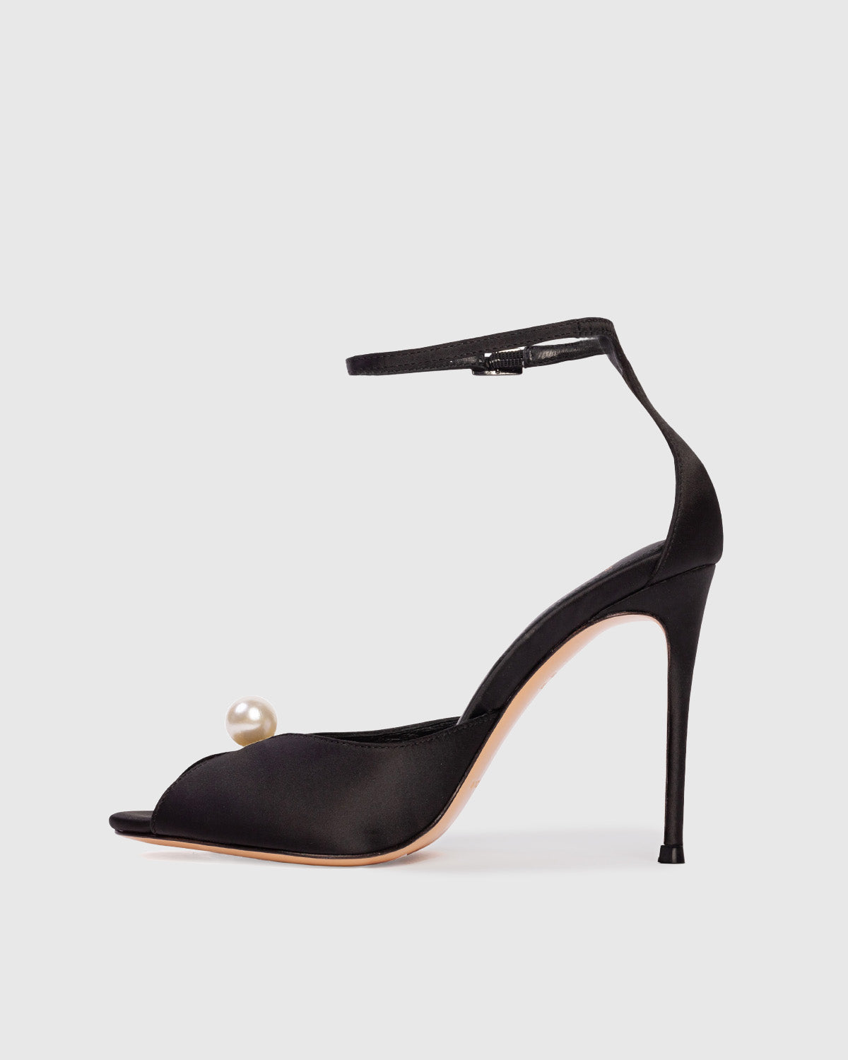 Round toe sandal with pearl detailing, set on a stiletto pin heel. Made with satin crepe.