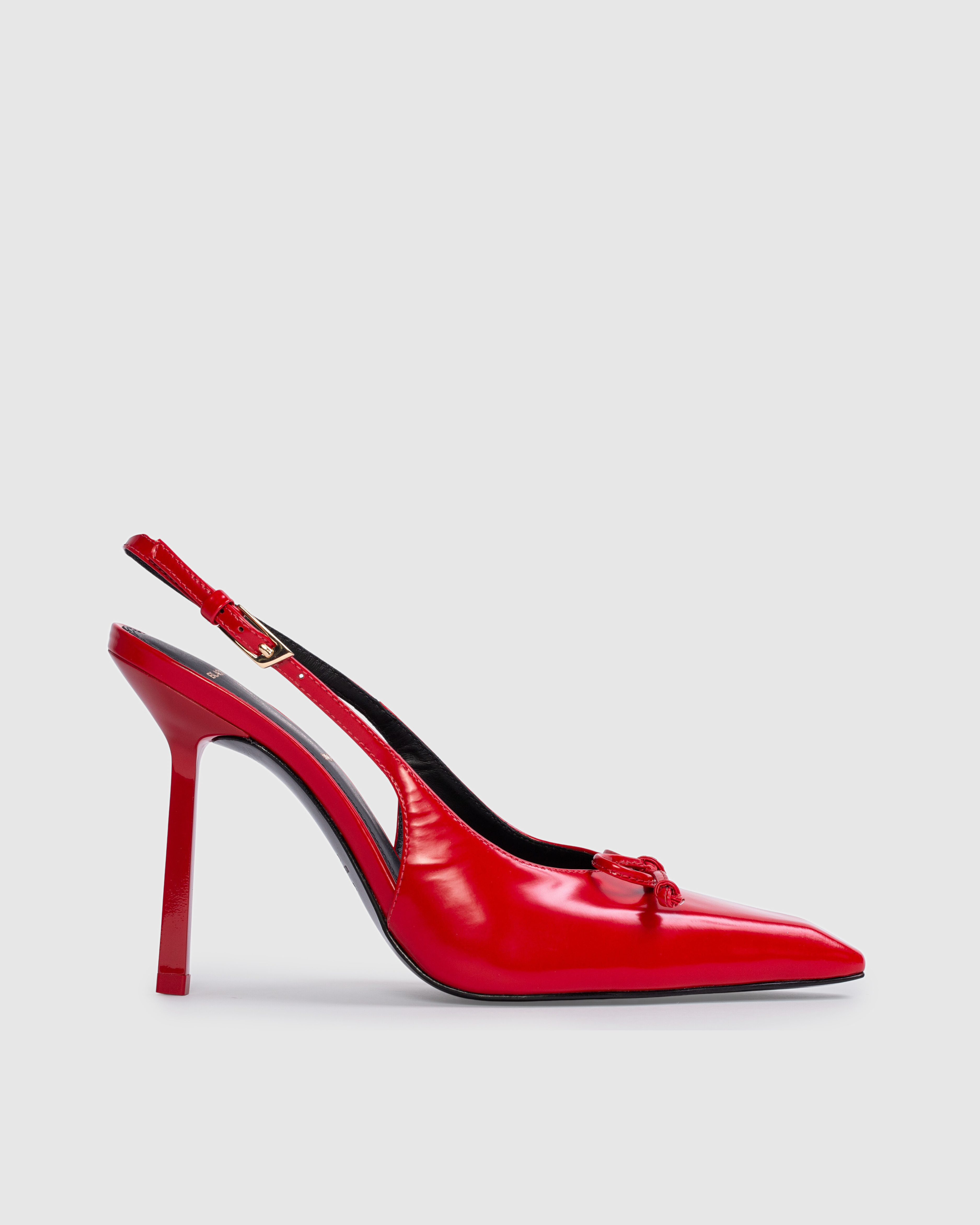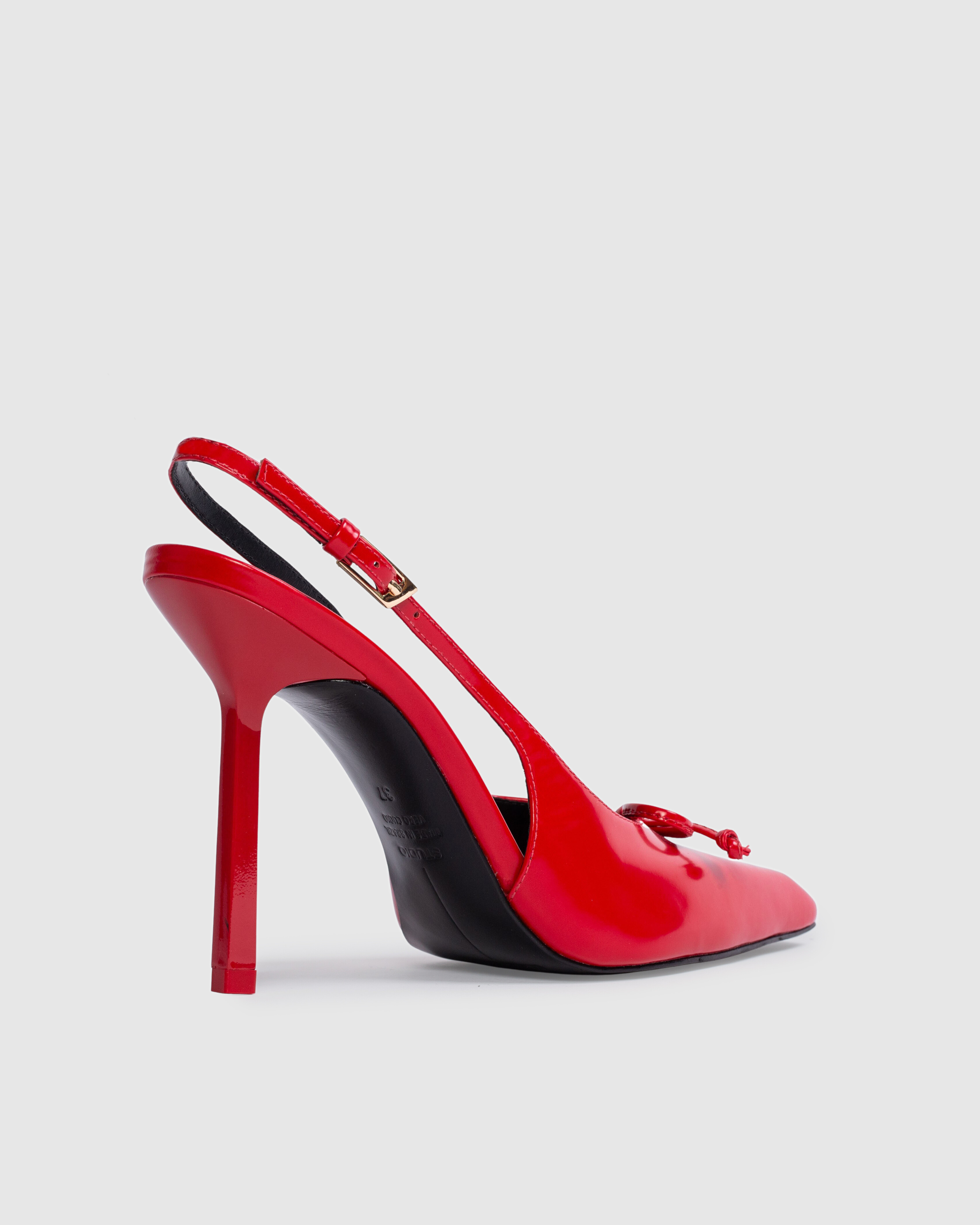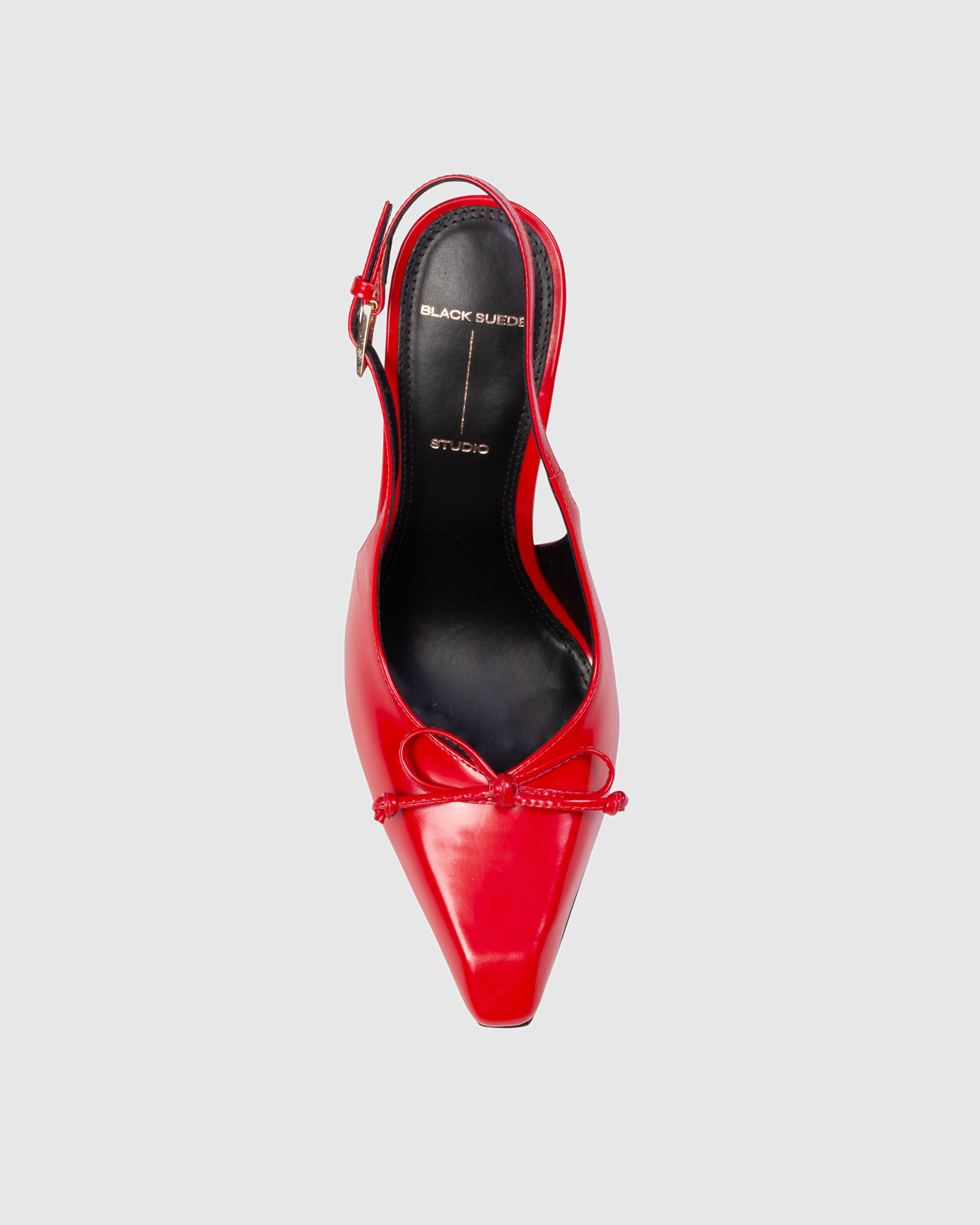 Snipped toe slingback pump with bow detailing, set on an asymmetric stiletto heel. Made with smooth box leather.