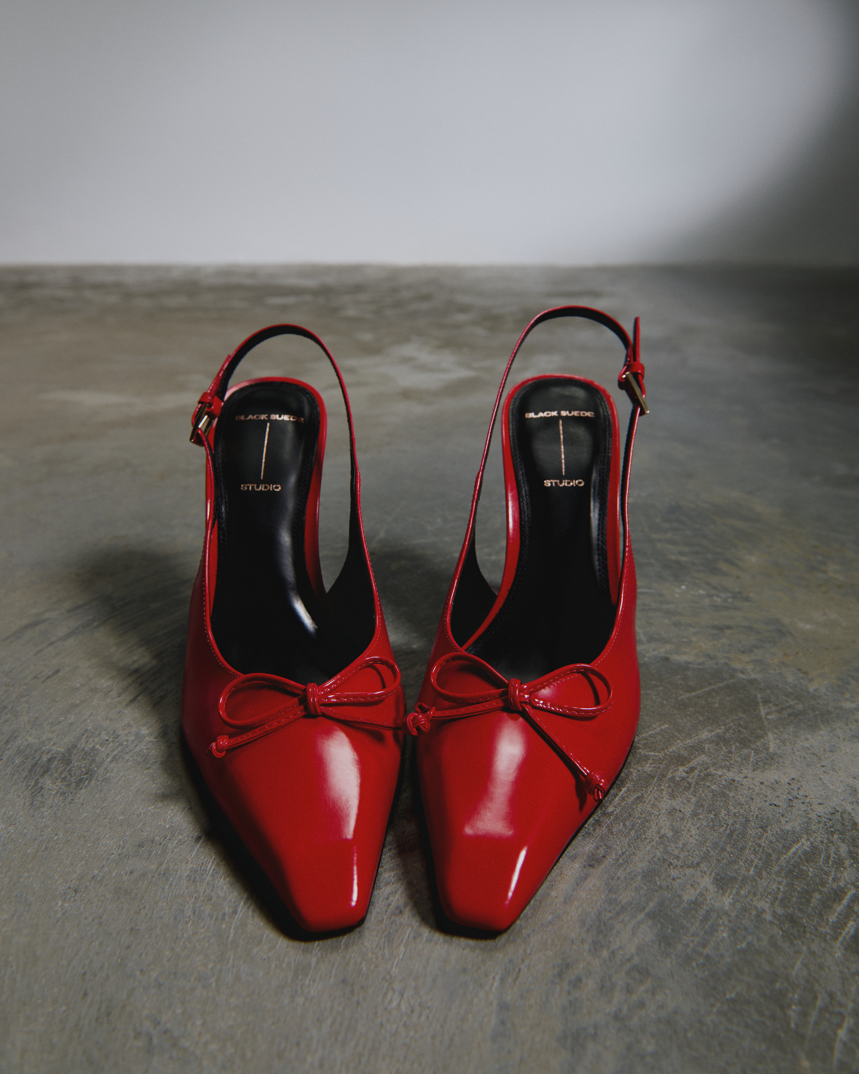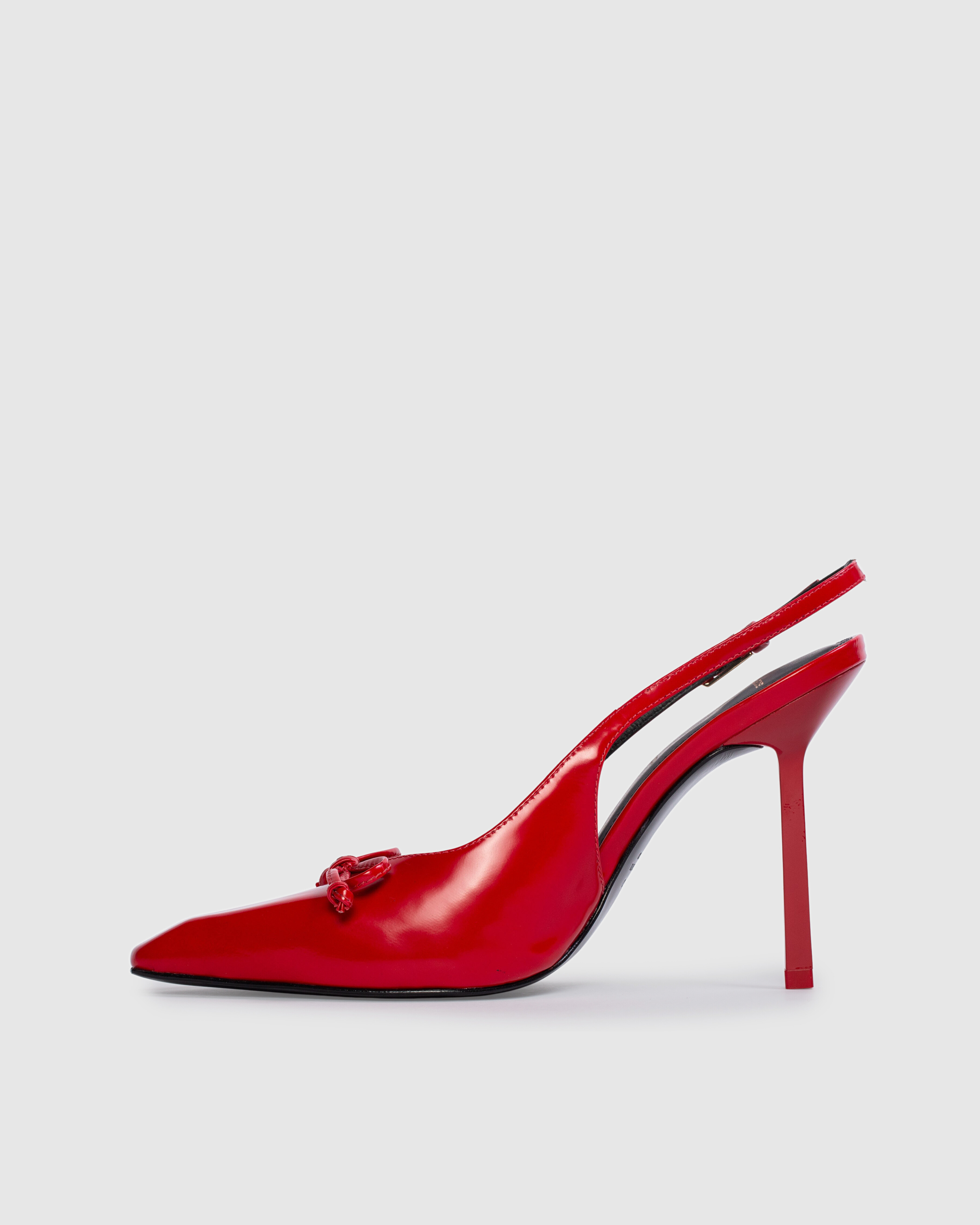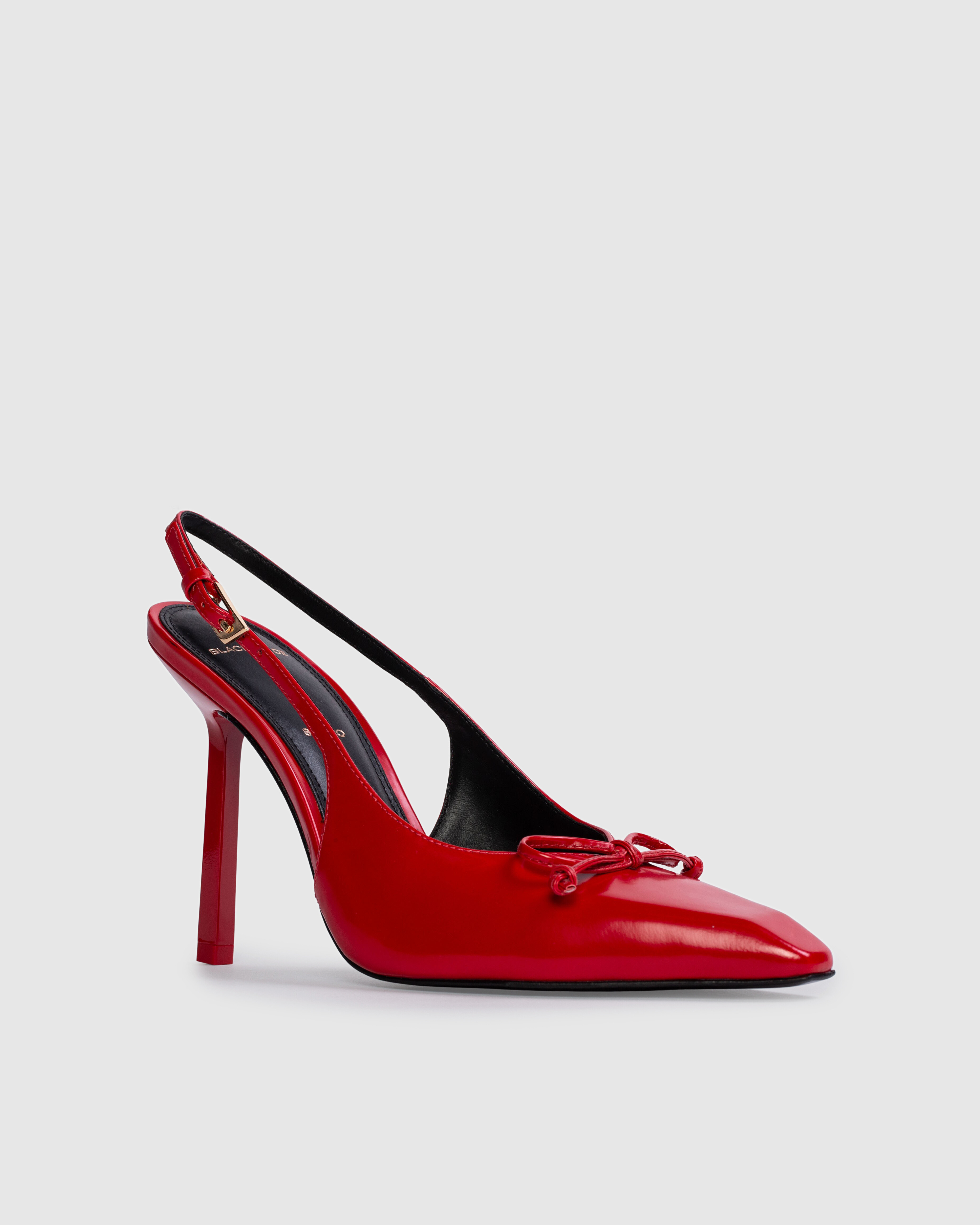 Snipped toe slingback pump with bow detailing, set on an asymmetric stiletto heel. Made with smooth box leather.