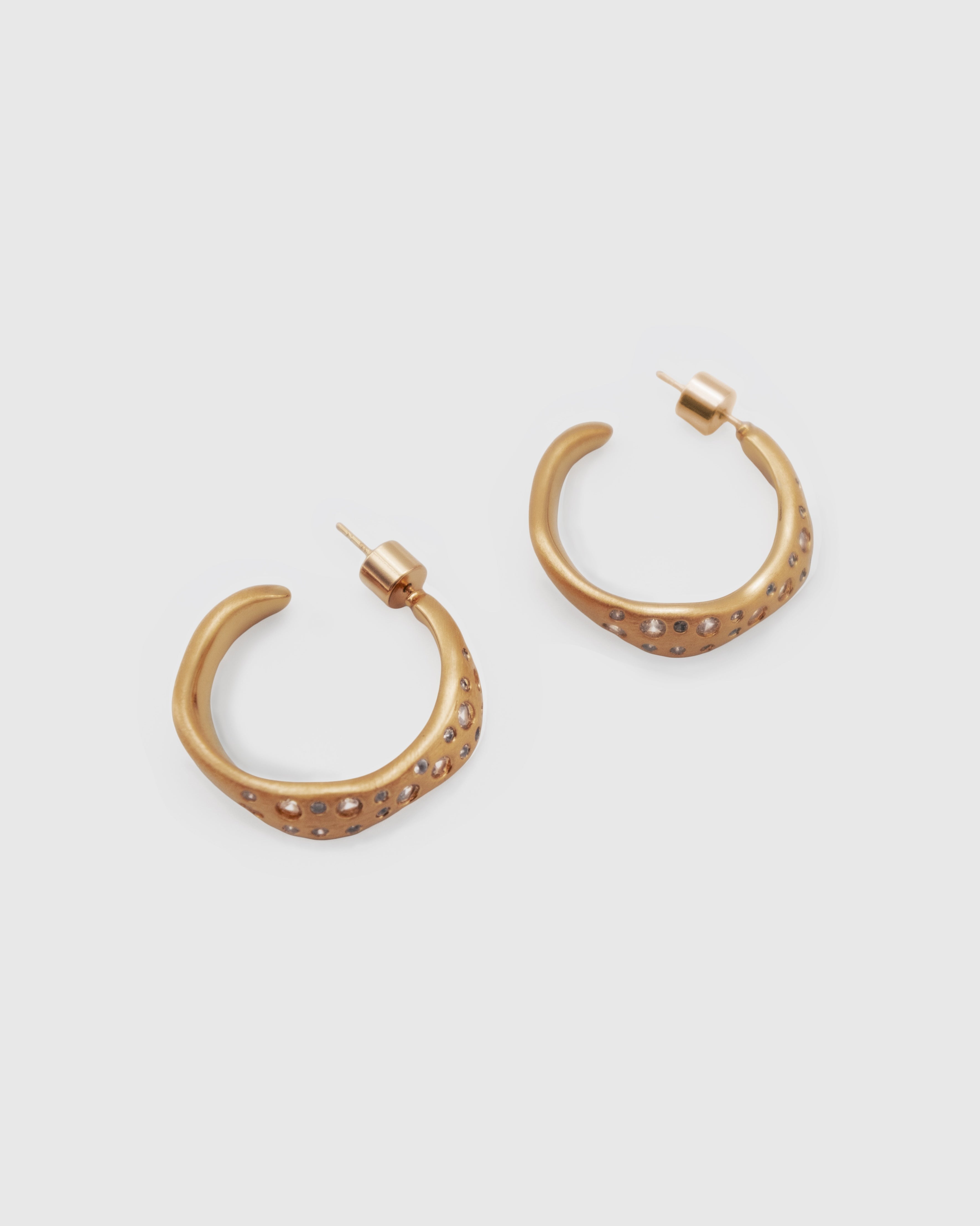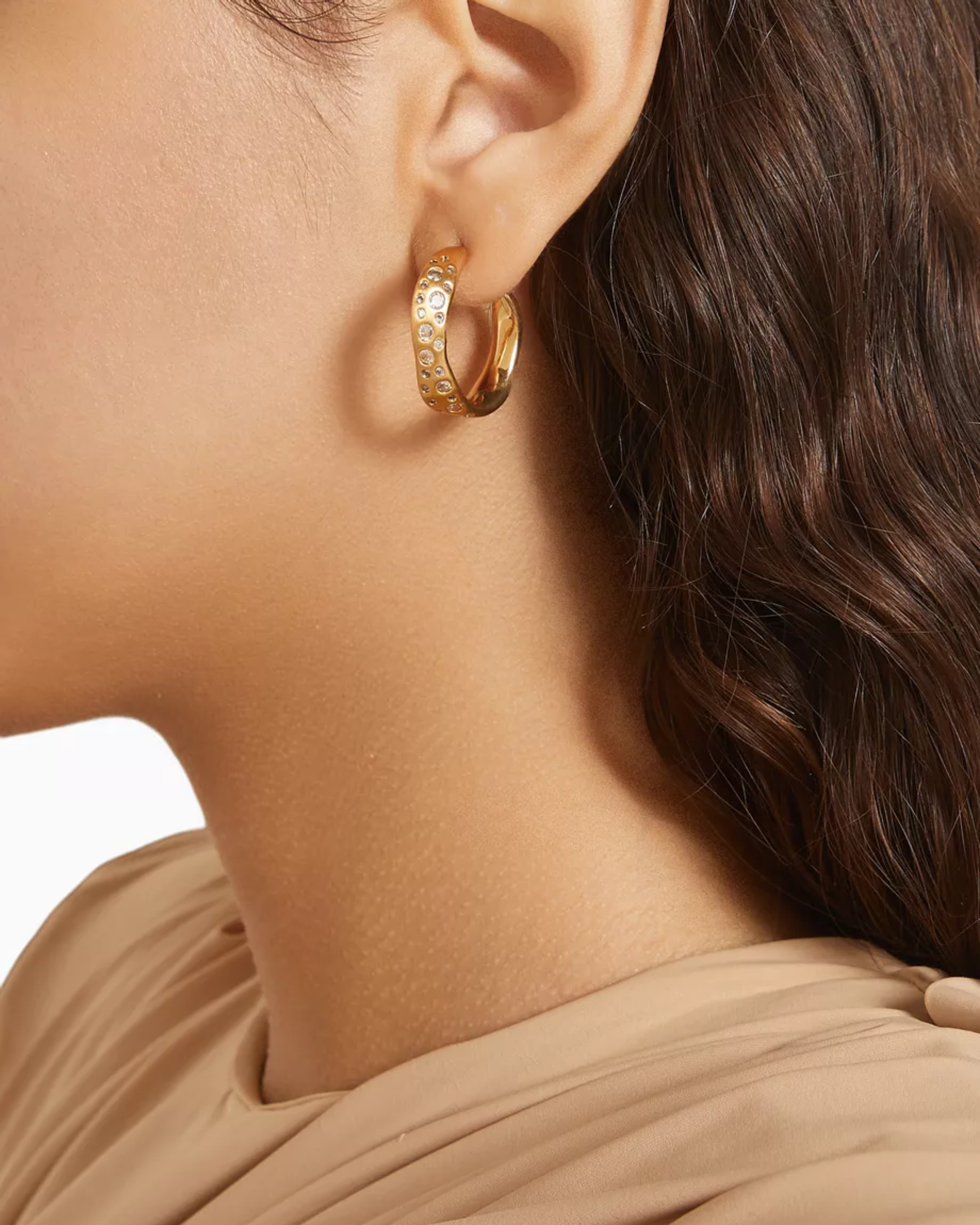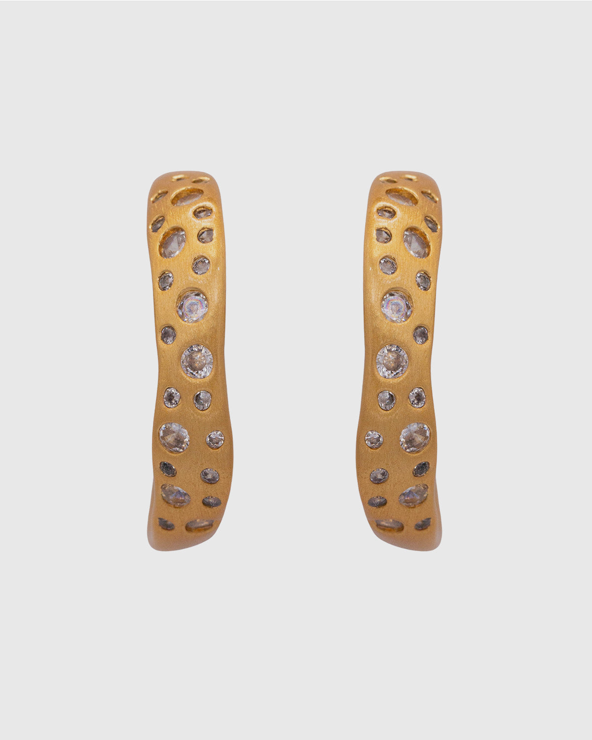 Set of wavey shaped hoop earrings with crystal stones. Made with premium 18k gold-plated brass.