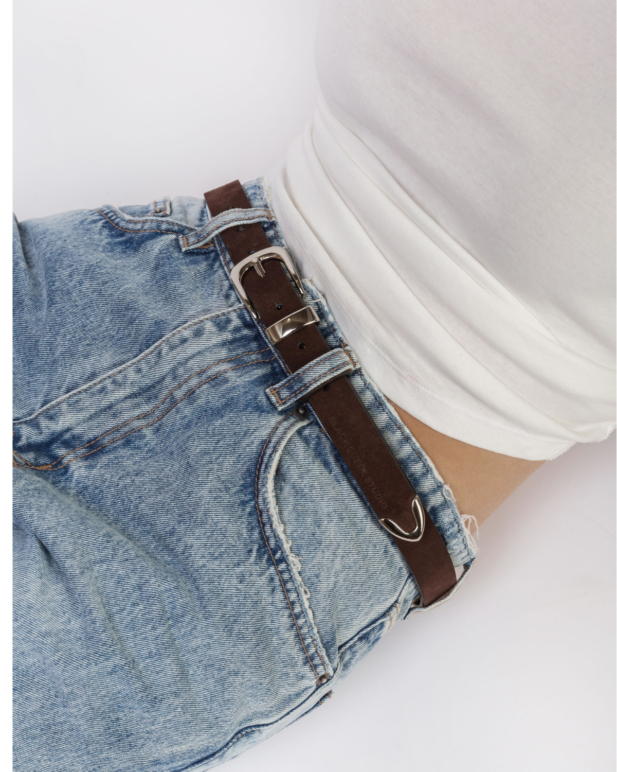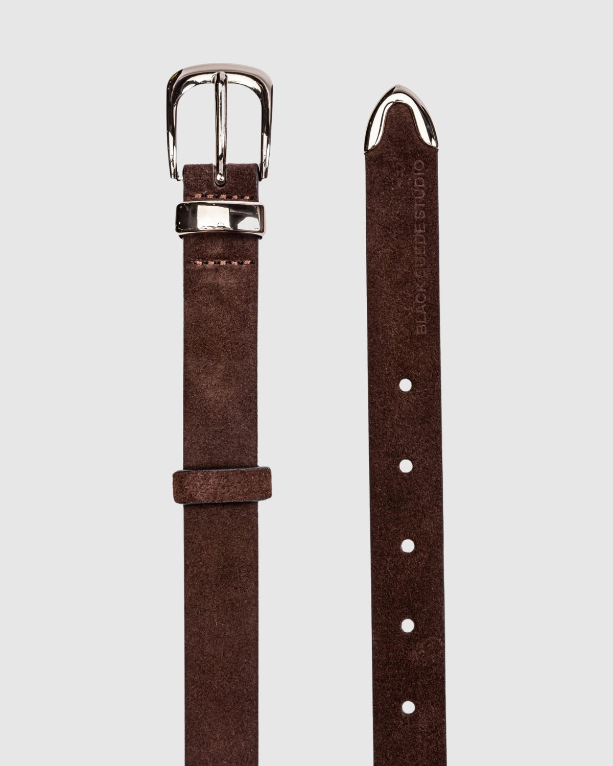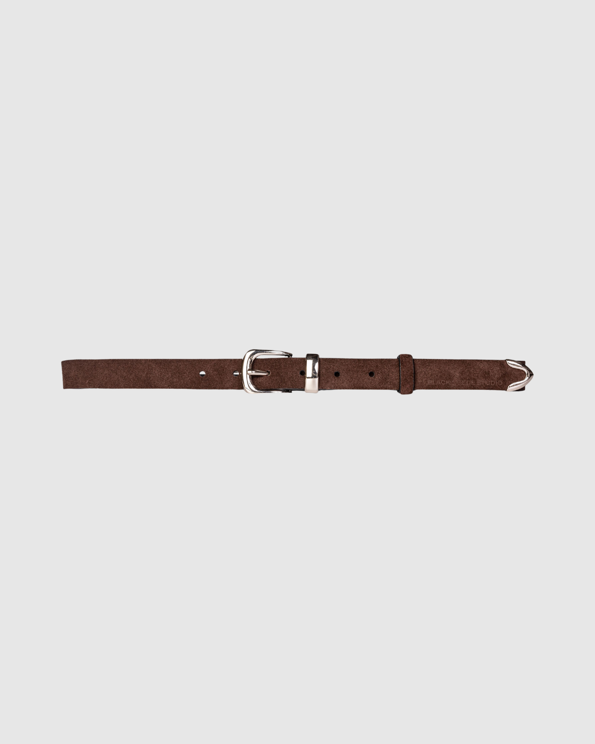 Silver plated brass modern western buckle. Secured on a brushed kid suede strap.