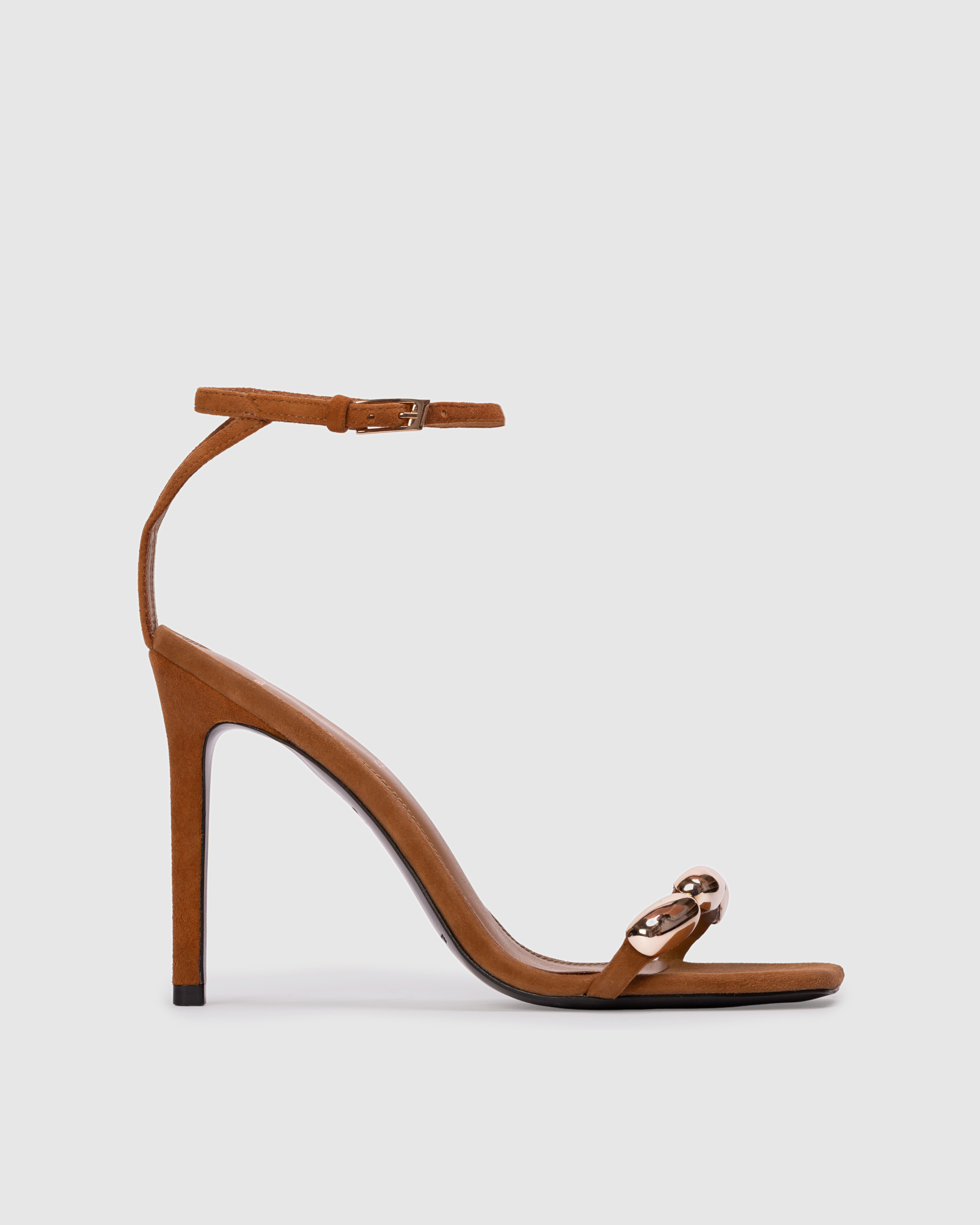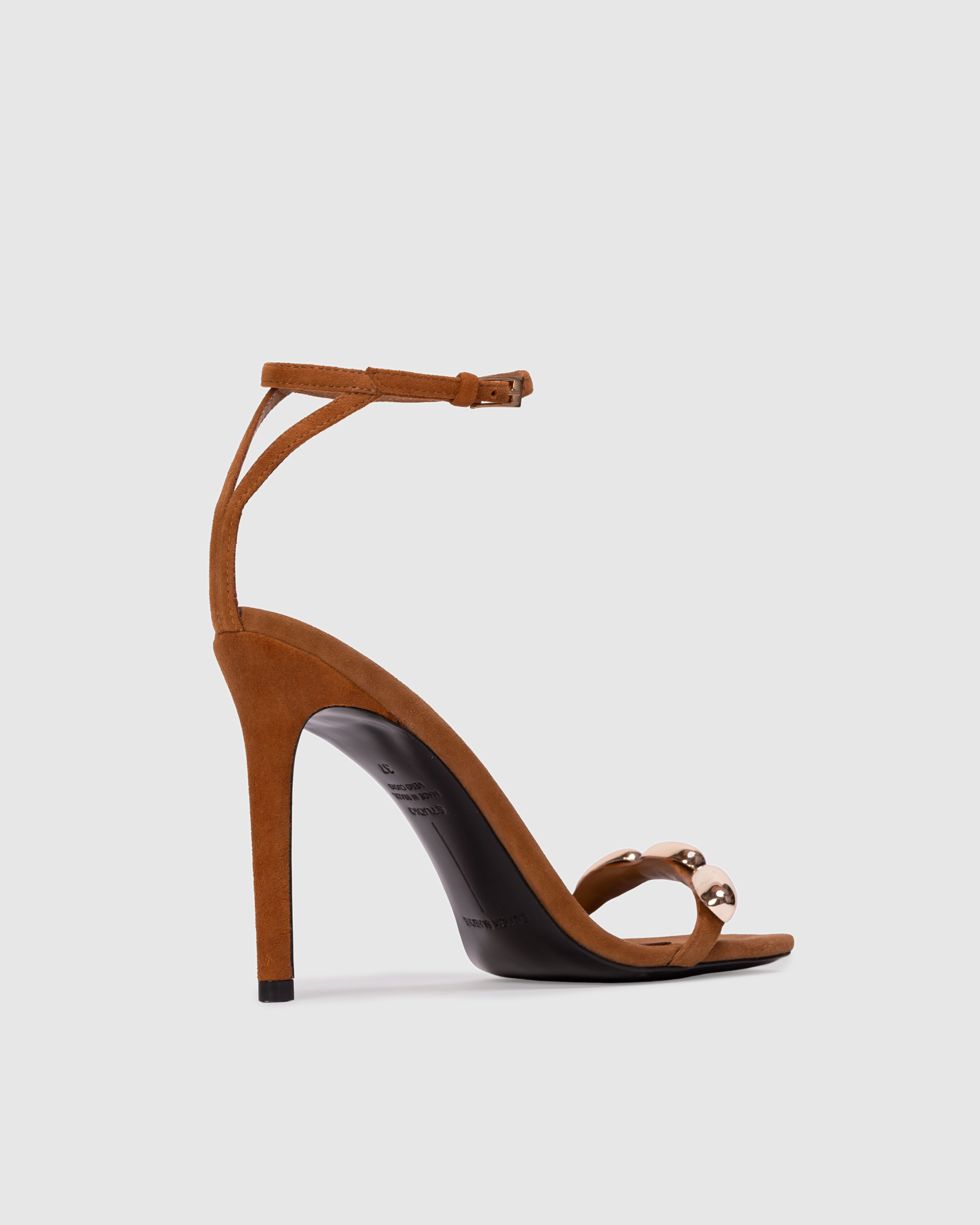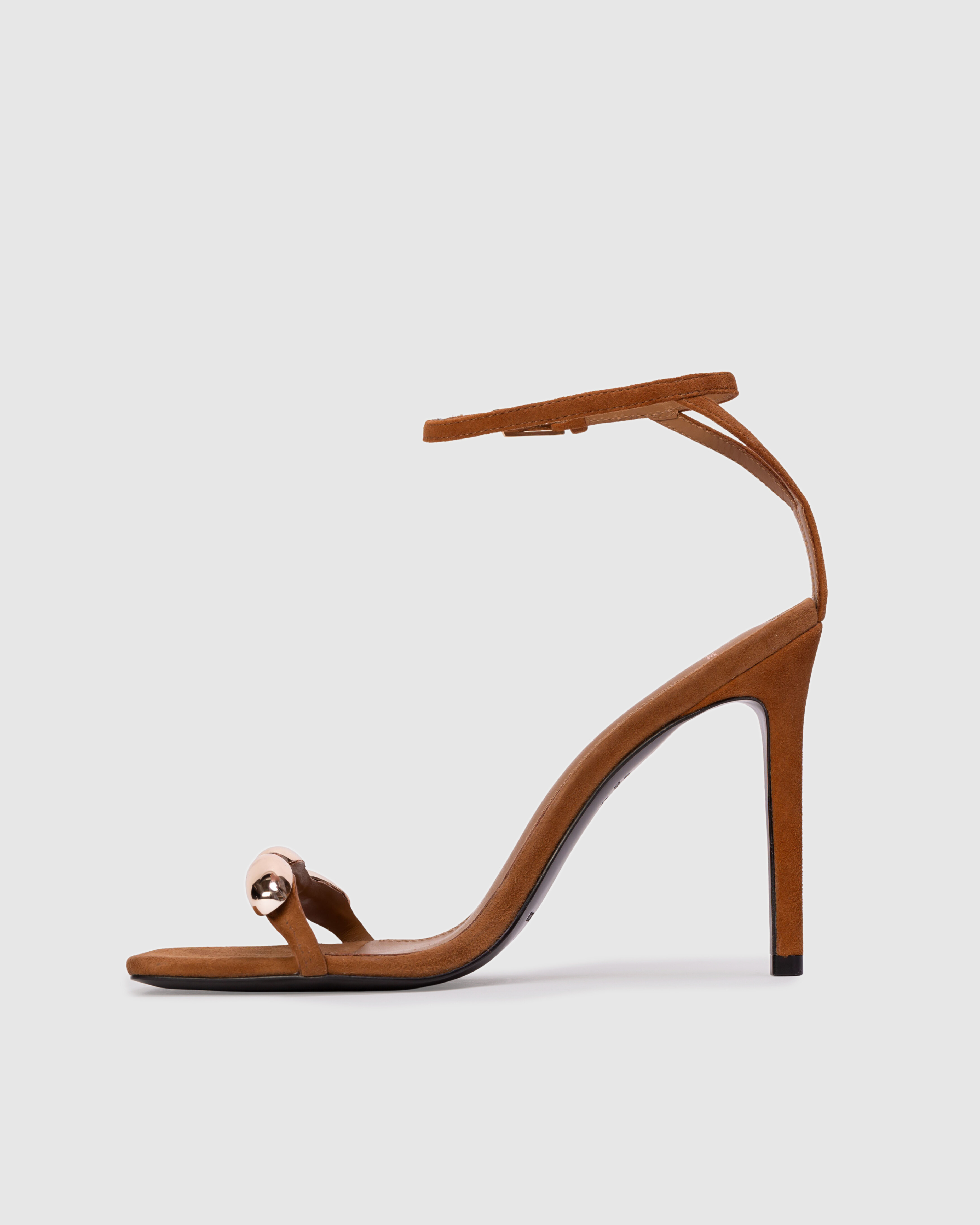 Square toe sandal with gold bean shaped ornaments, set on a straight stiletto heel. Made with brushed kid suede.