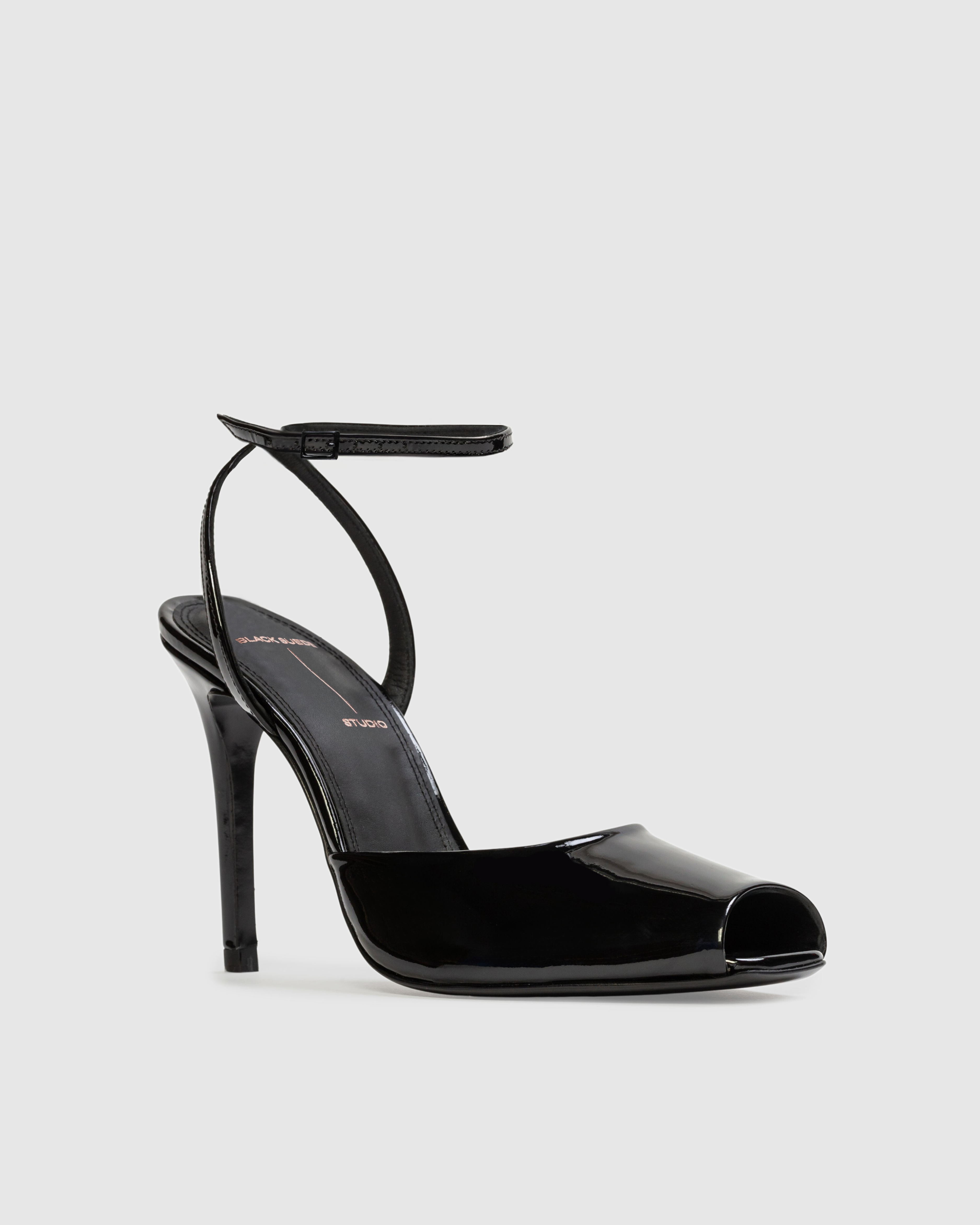 Micro peep toe sandal, set on a straight stiletto heel. Made with smooth patent finished leather.