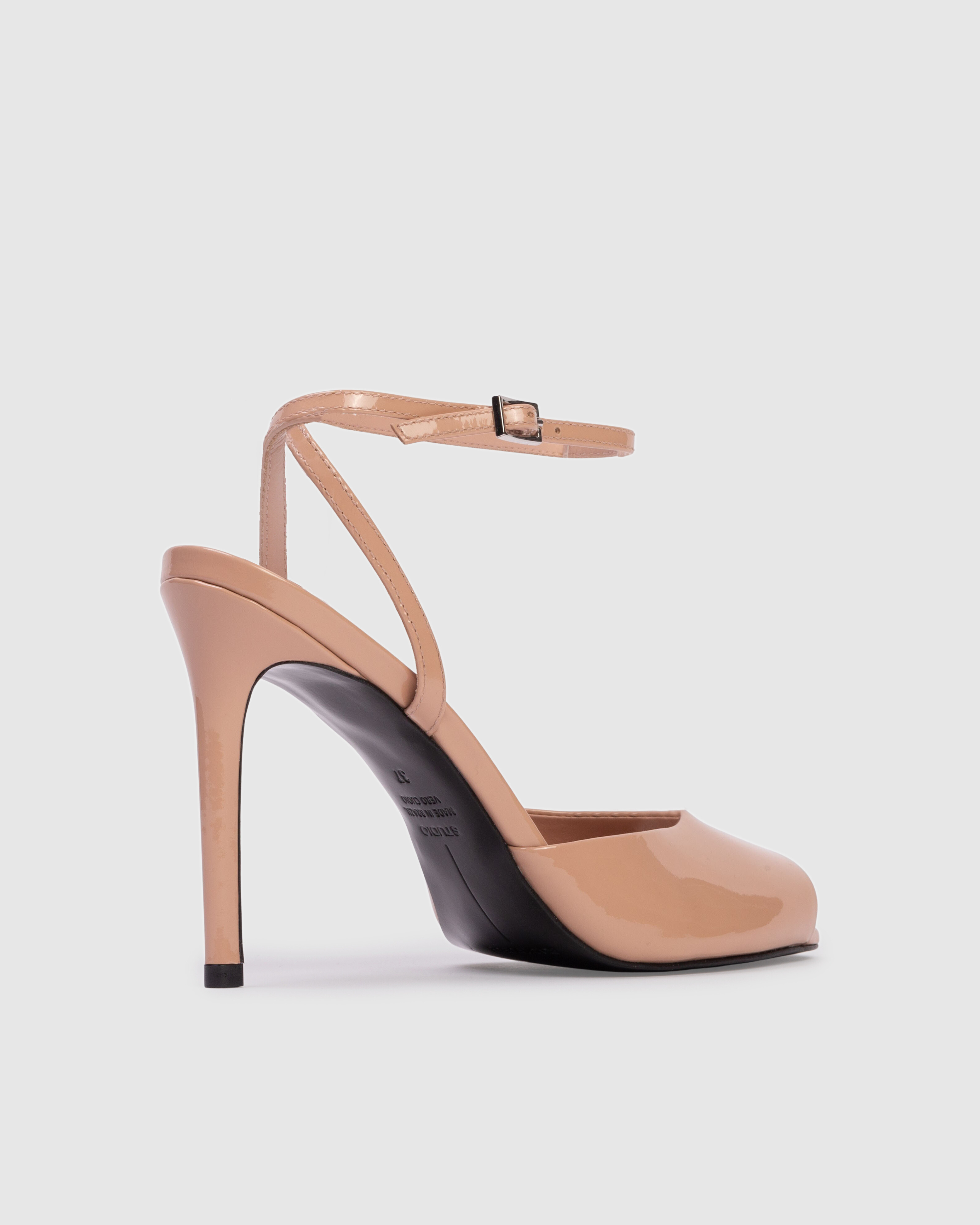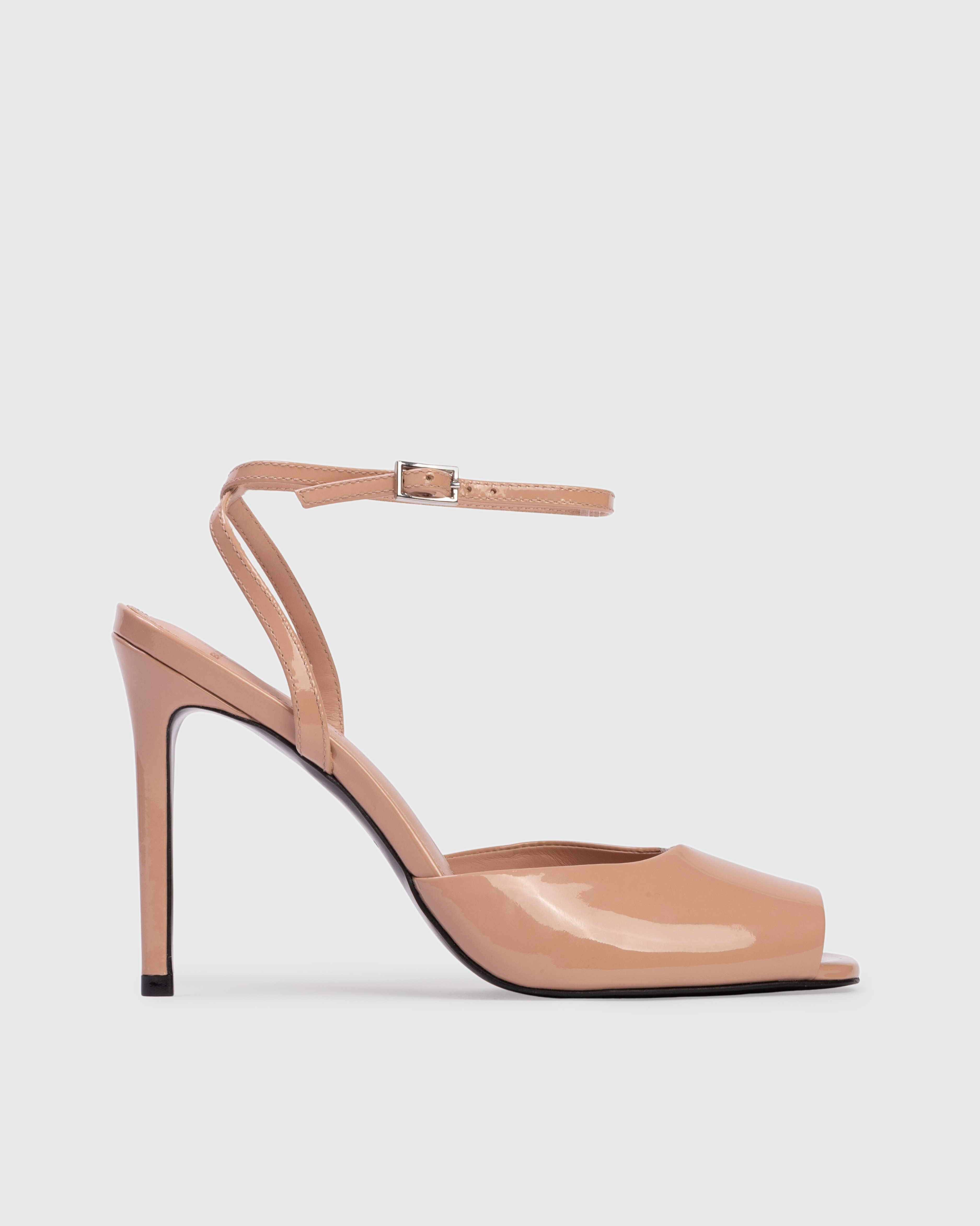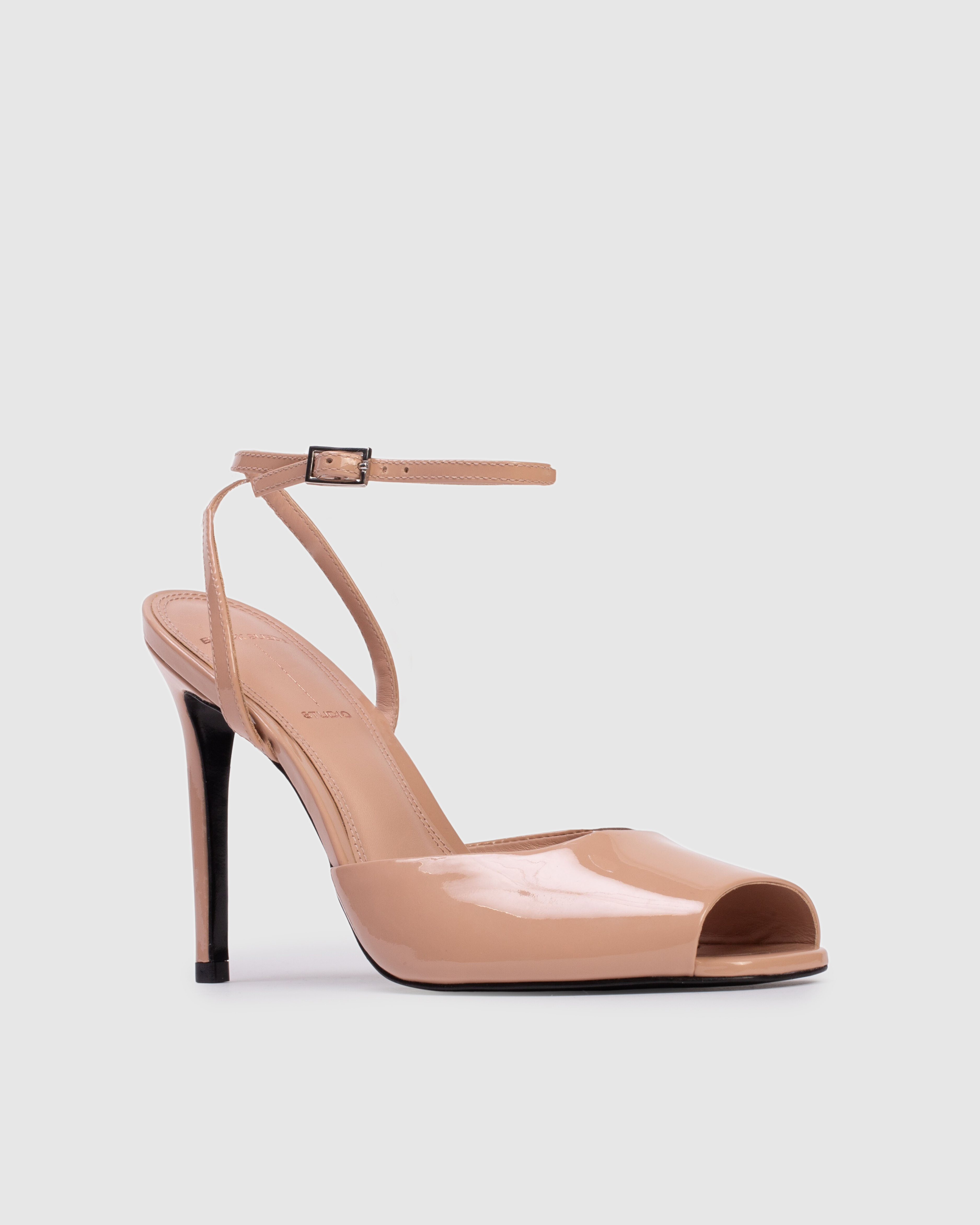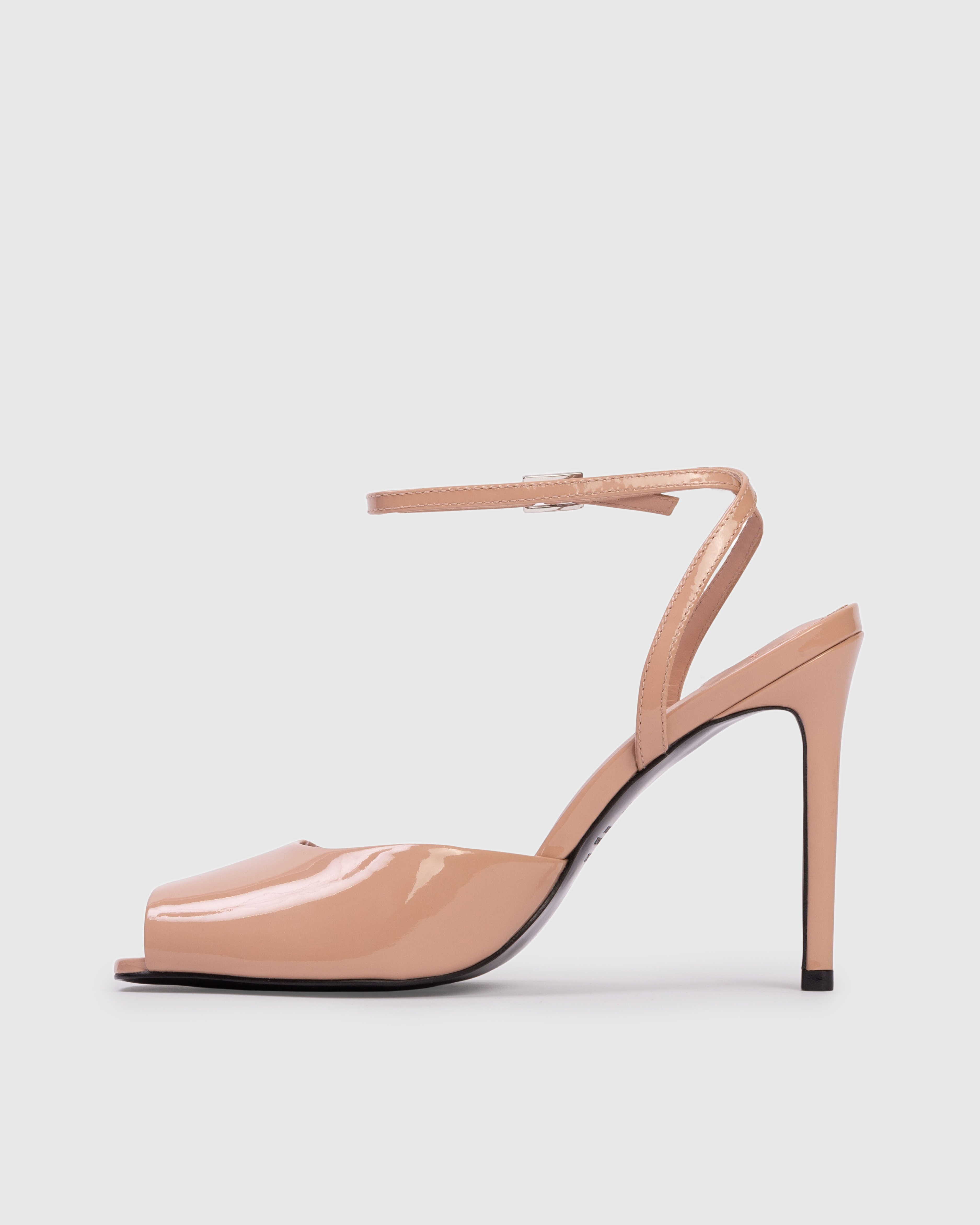 Micro peep toe sandal, set on a straight stiletto heel. Made with smooth patent finished leather.