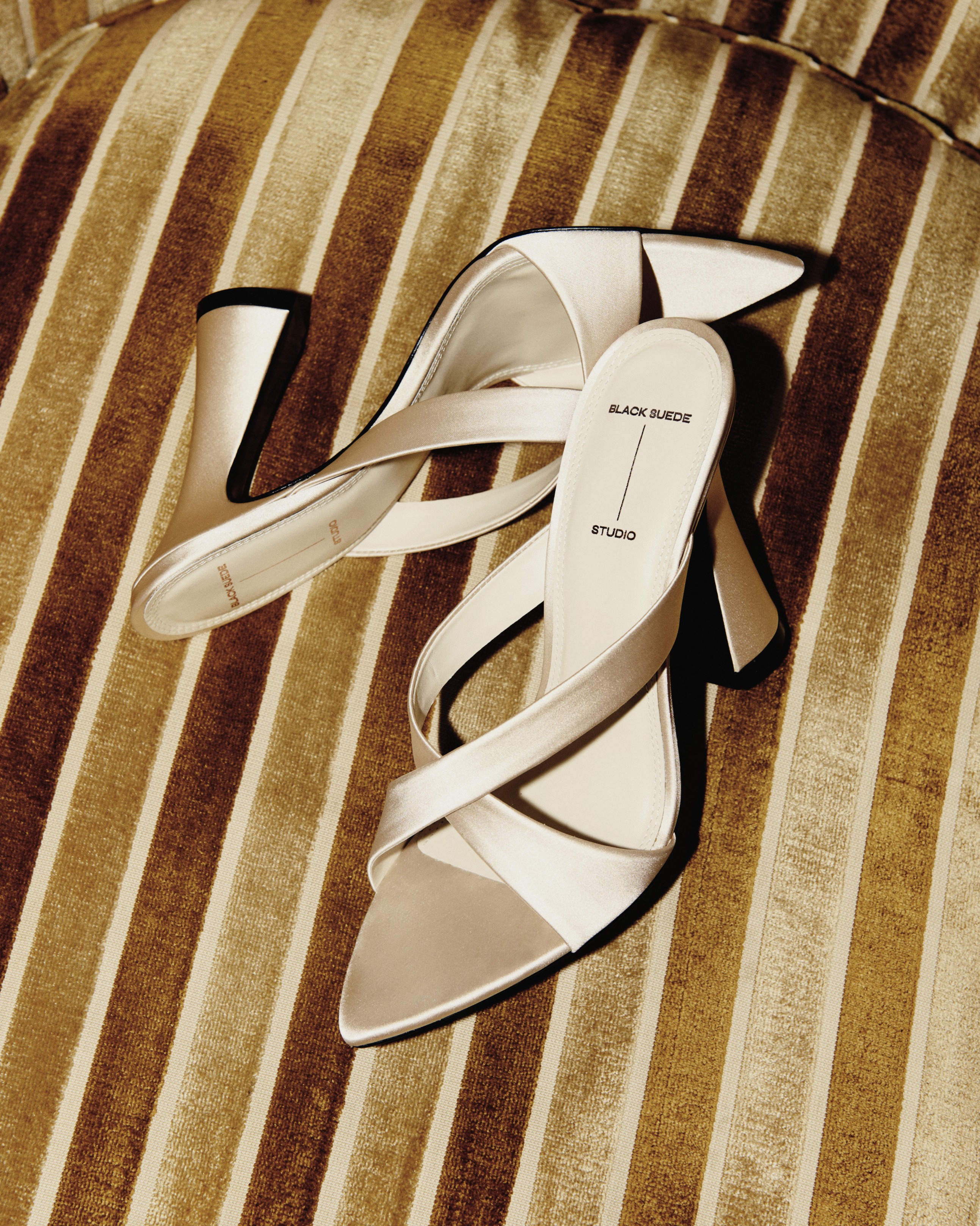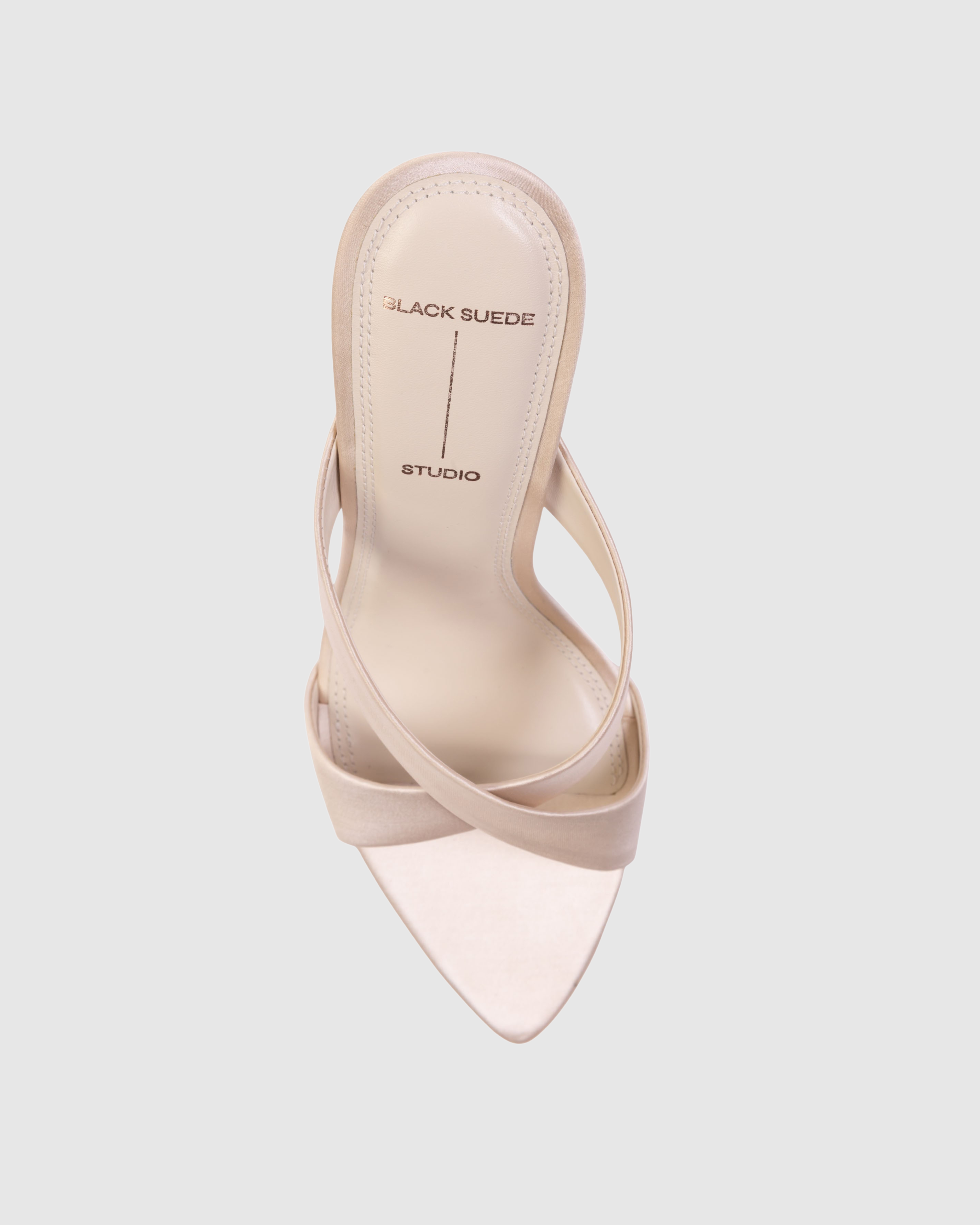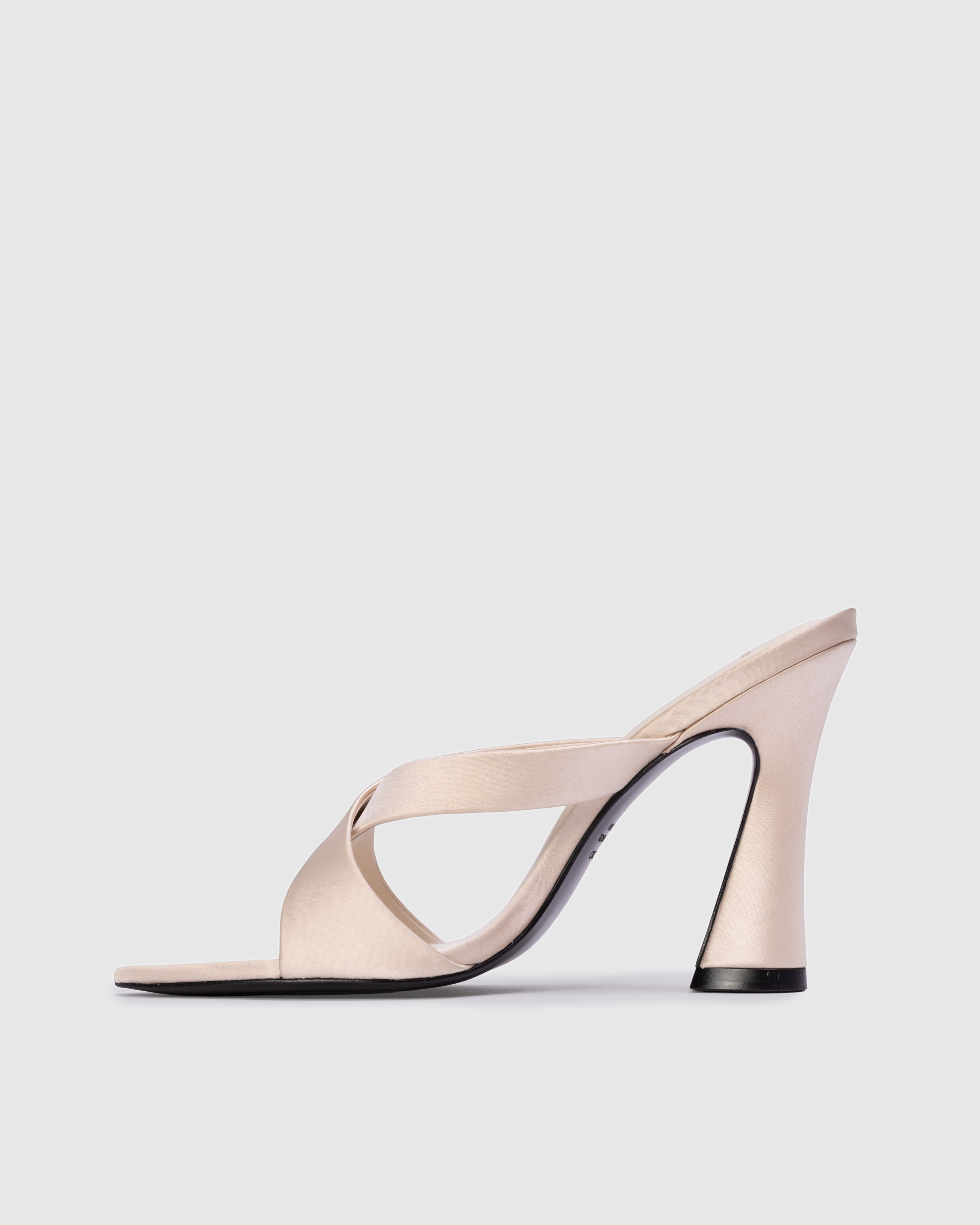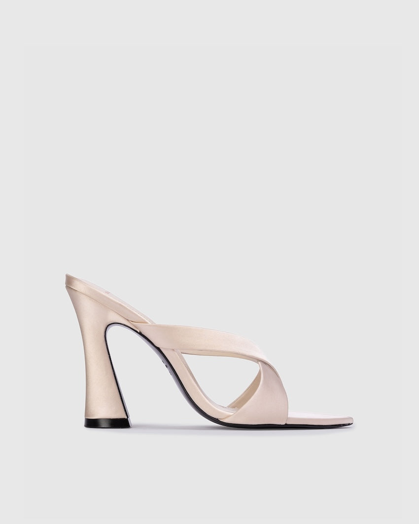 pointy toe slipper mule with a criss cross upper detail, set on a flared stiletto heel. Made with satin crepe.